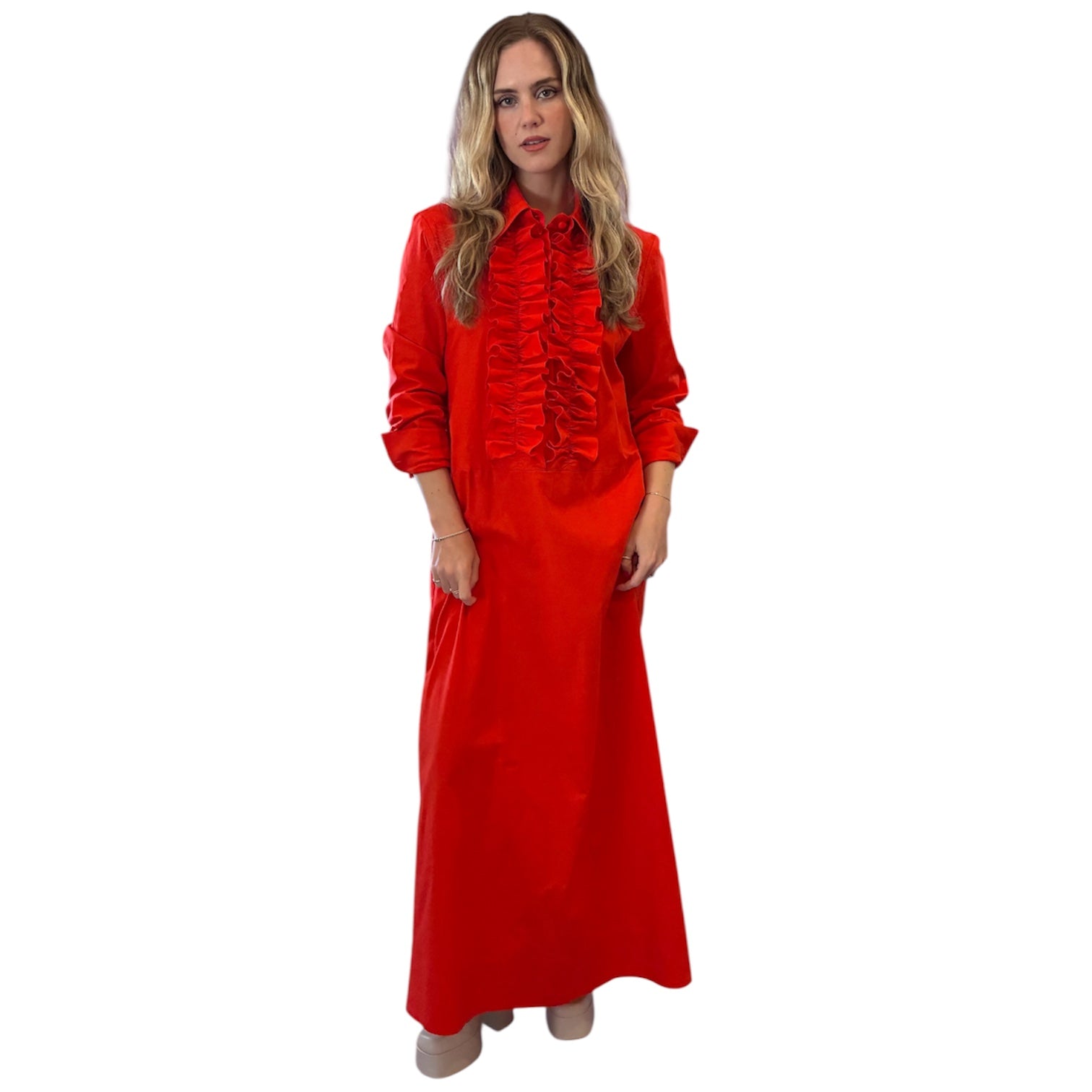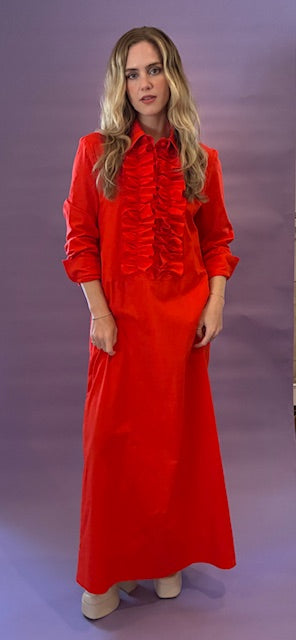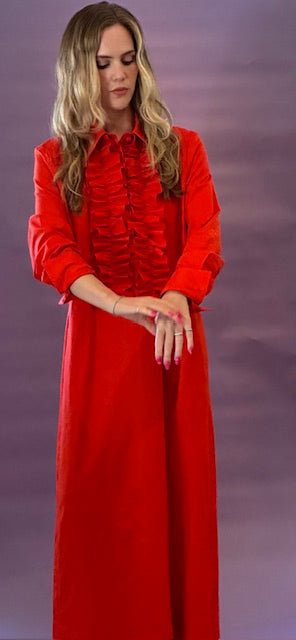 Meet our newest Cheeky style! The Ruffle Front Dress! It's our classic shirt dress with full collar and cuffs. We designed the skirt to be A-line and simple with more emphasis on the bodice. The lovely ruffle on both sides of the front buttons adds just the right amount of whim. Shown in red.