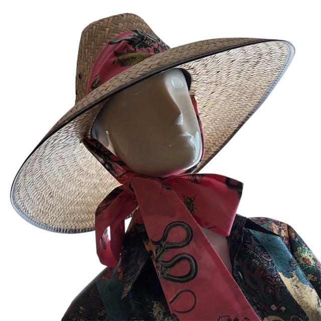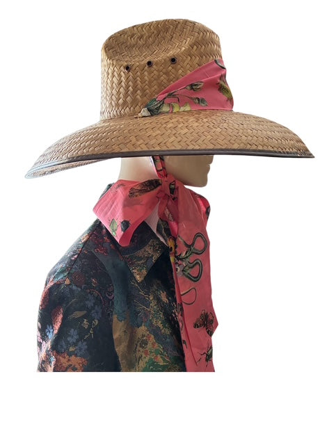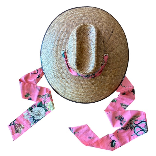 Adorable, natural straw sun hat with various cheeky fabrics threaded through two grommets. Can be worn tied under chin or in back. Very French chic.