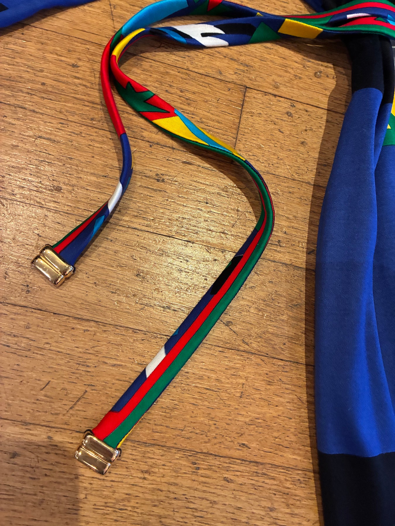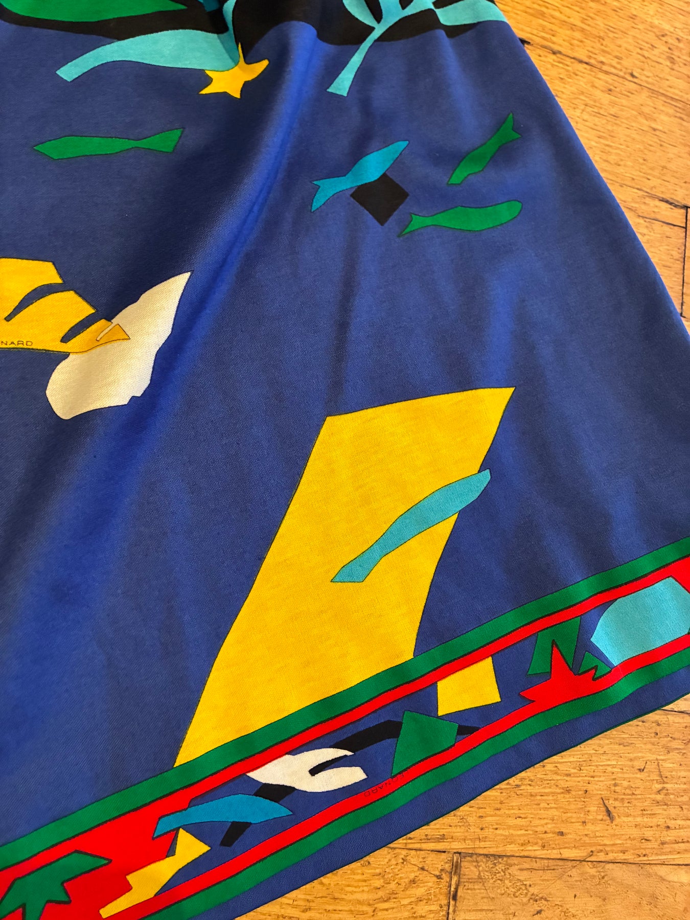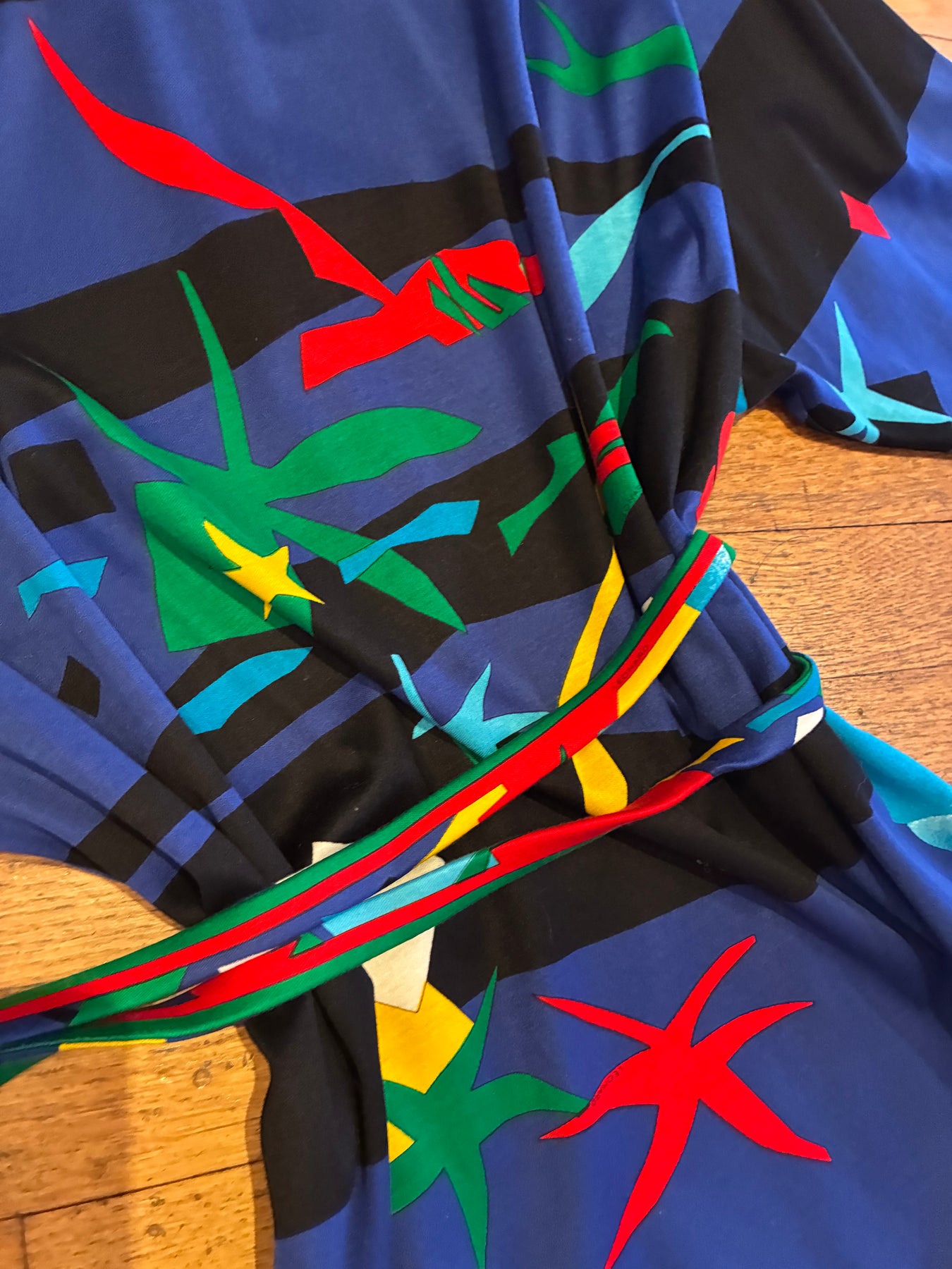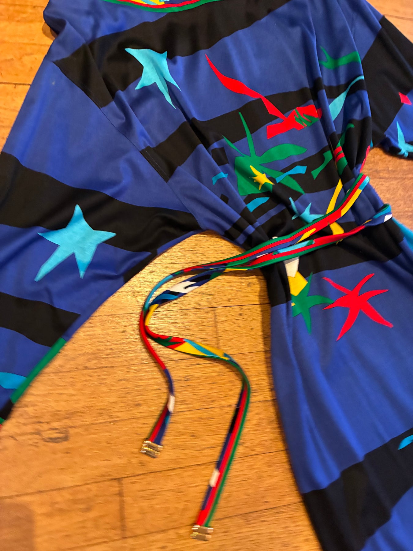 Cotton Knit Leonard Dress. Navy blue background with black stripes, stars, and splashes of color. Round Neck and slight dolman sleeves. Adorable dress. Zips partway up the back. Matching Belt