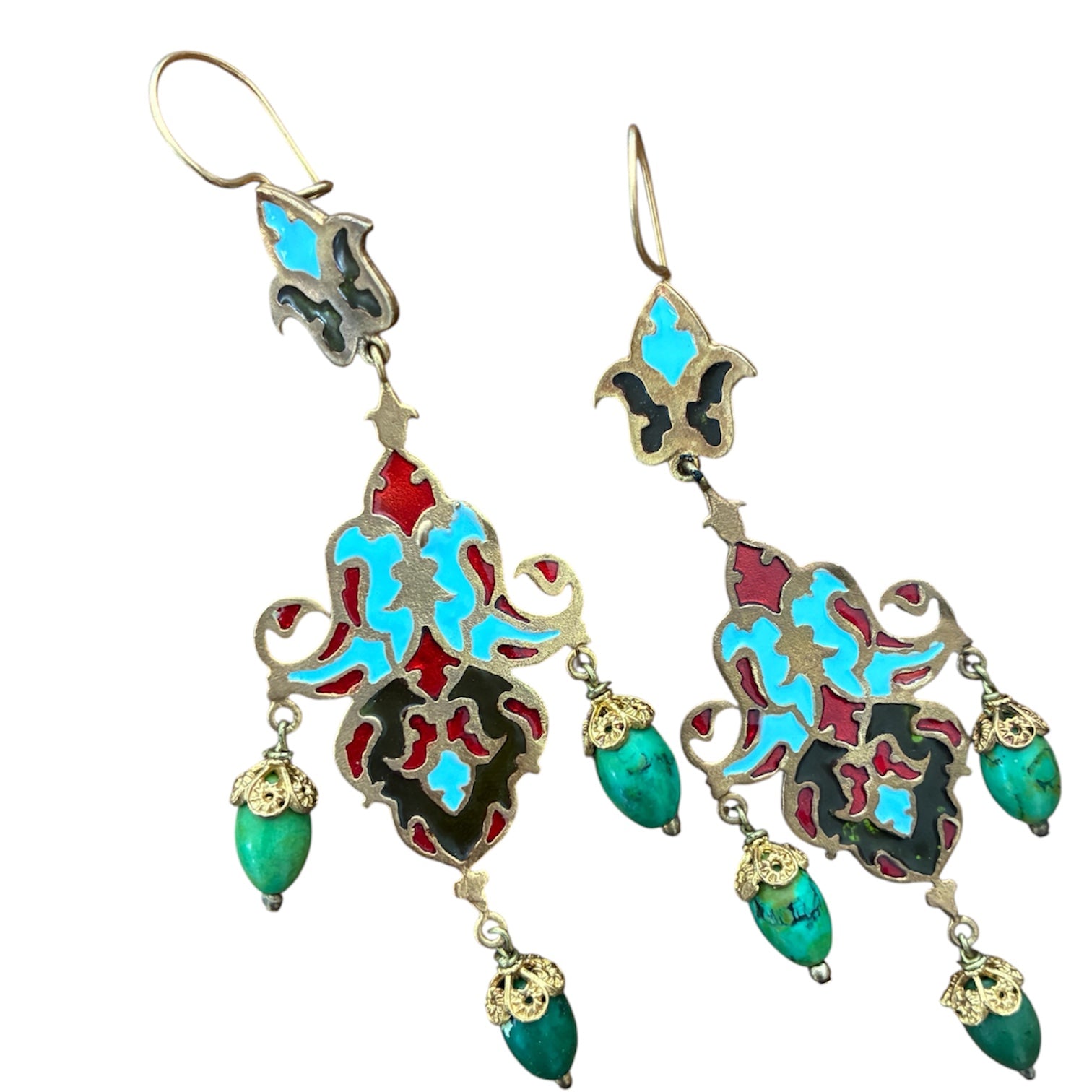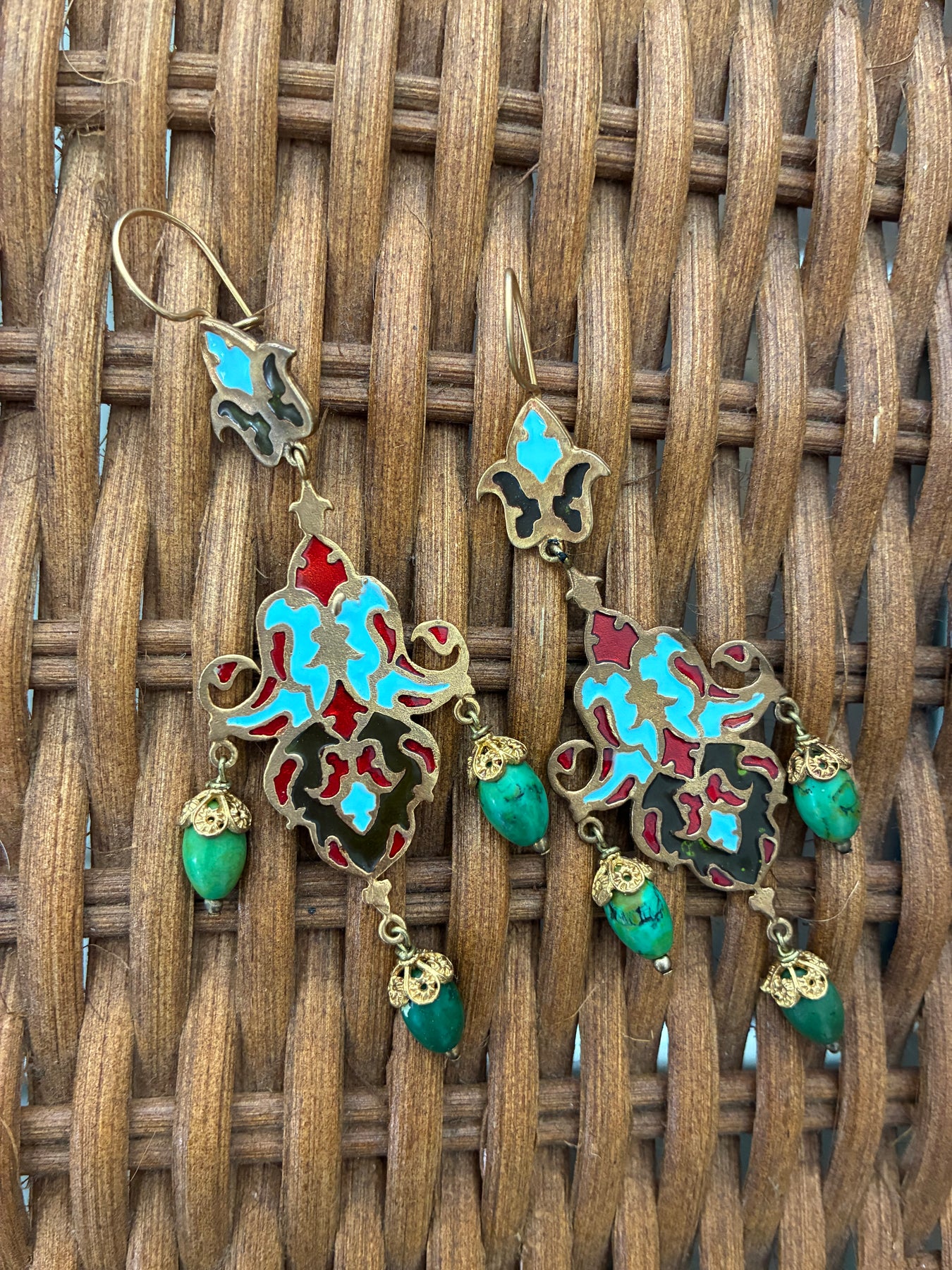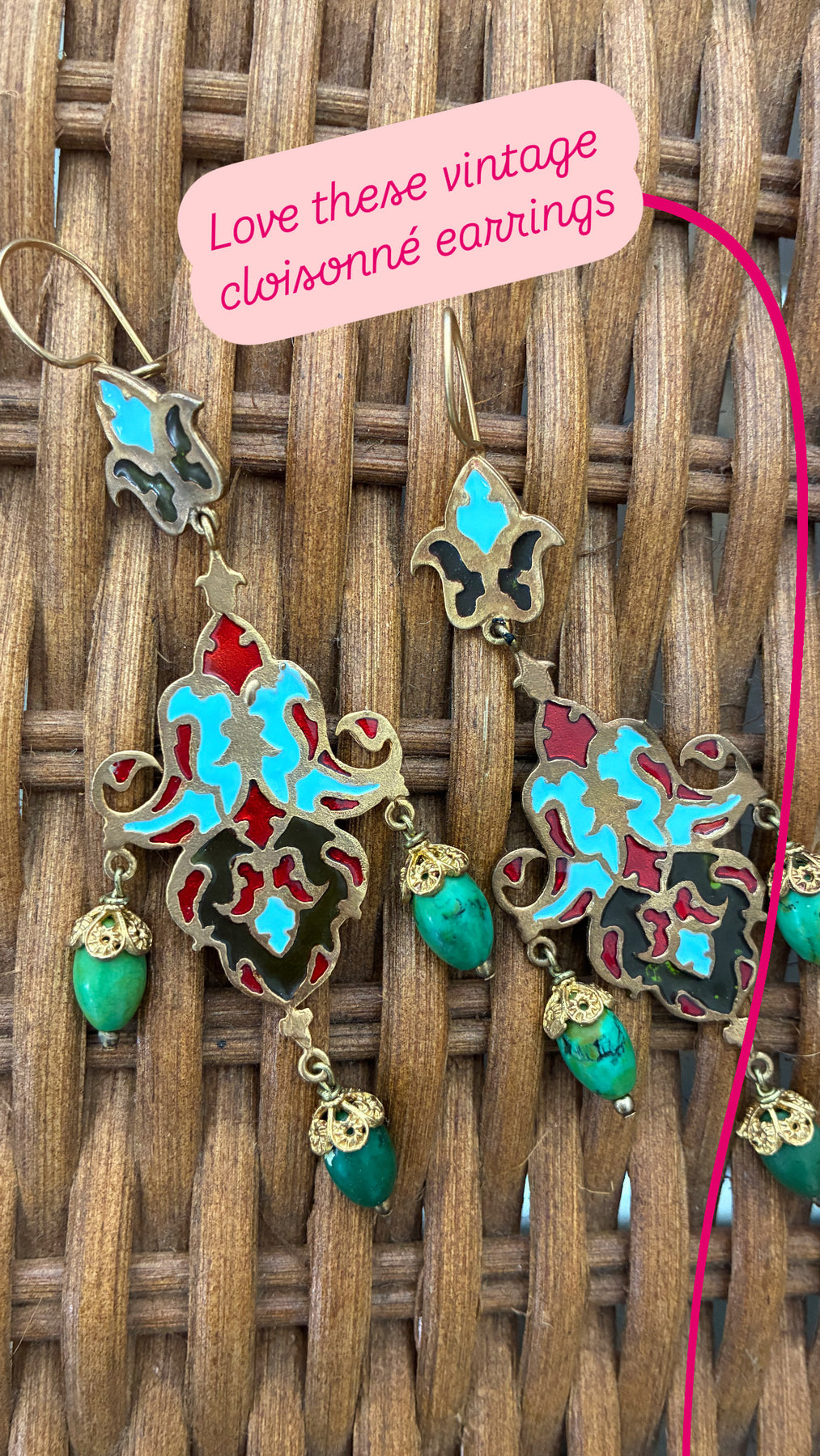 Such a lovely pair of enameled earrings in tones of aqua, navy, red and green.  Hook.