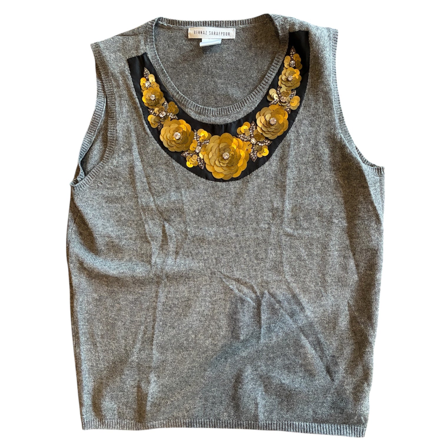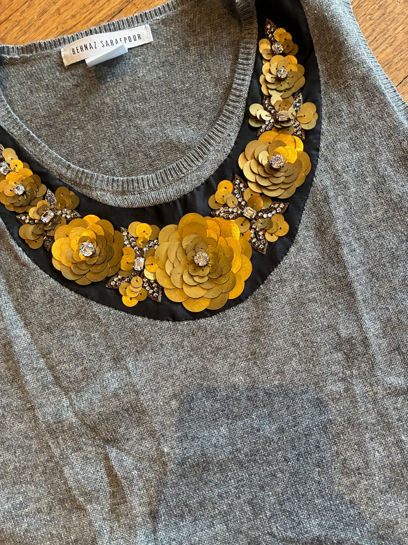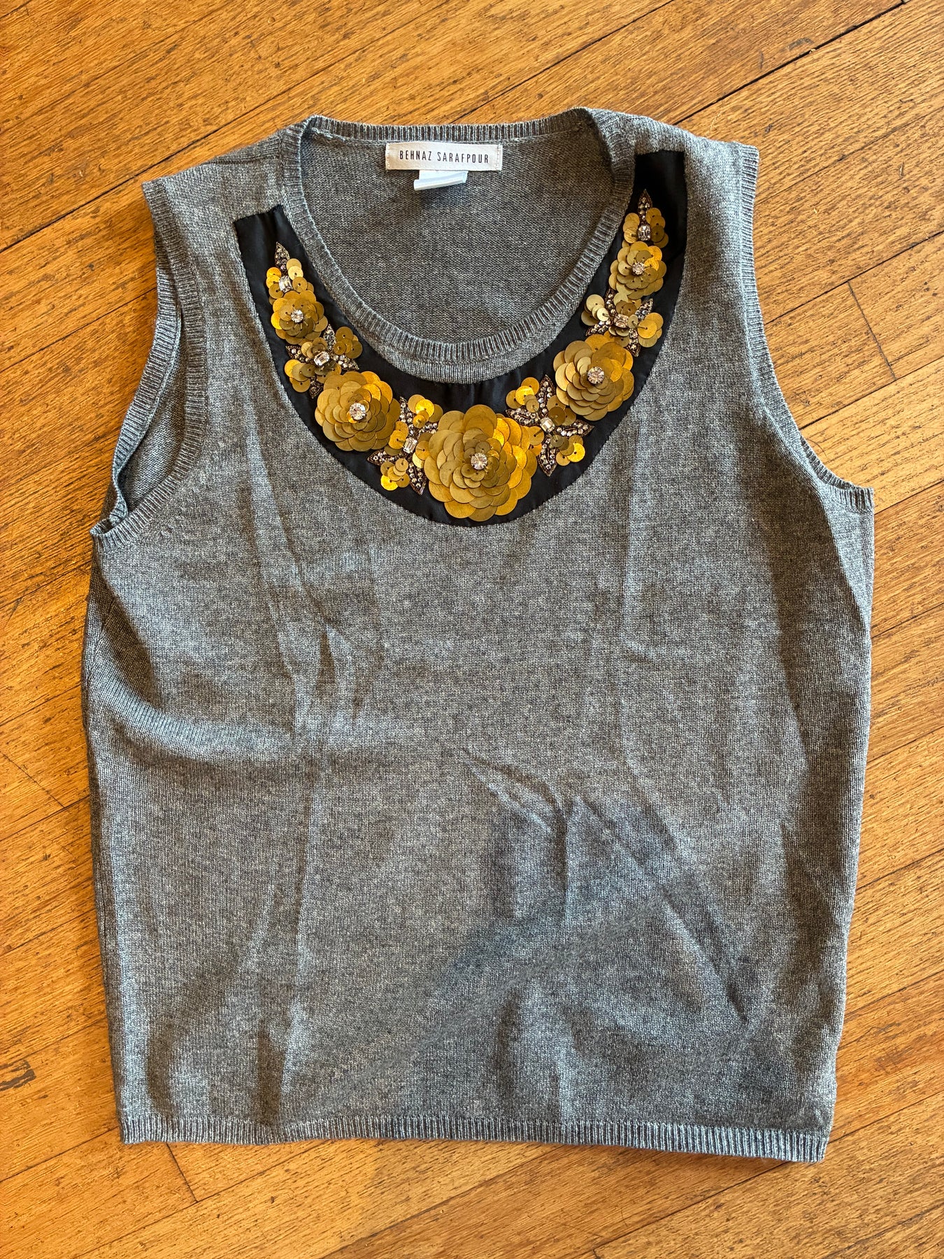 Gorgeous sequined and brass neckline on a grey vest by Behnaz Sarafpour.  Knit