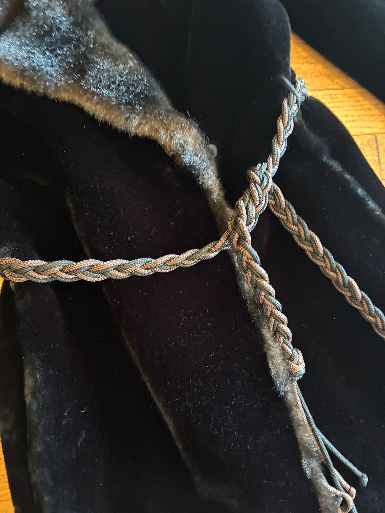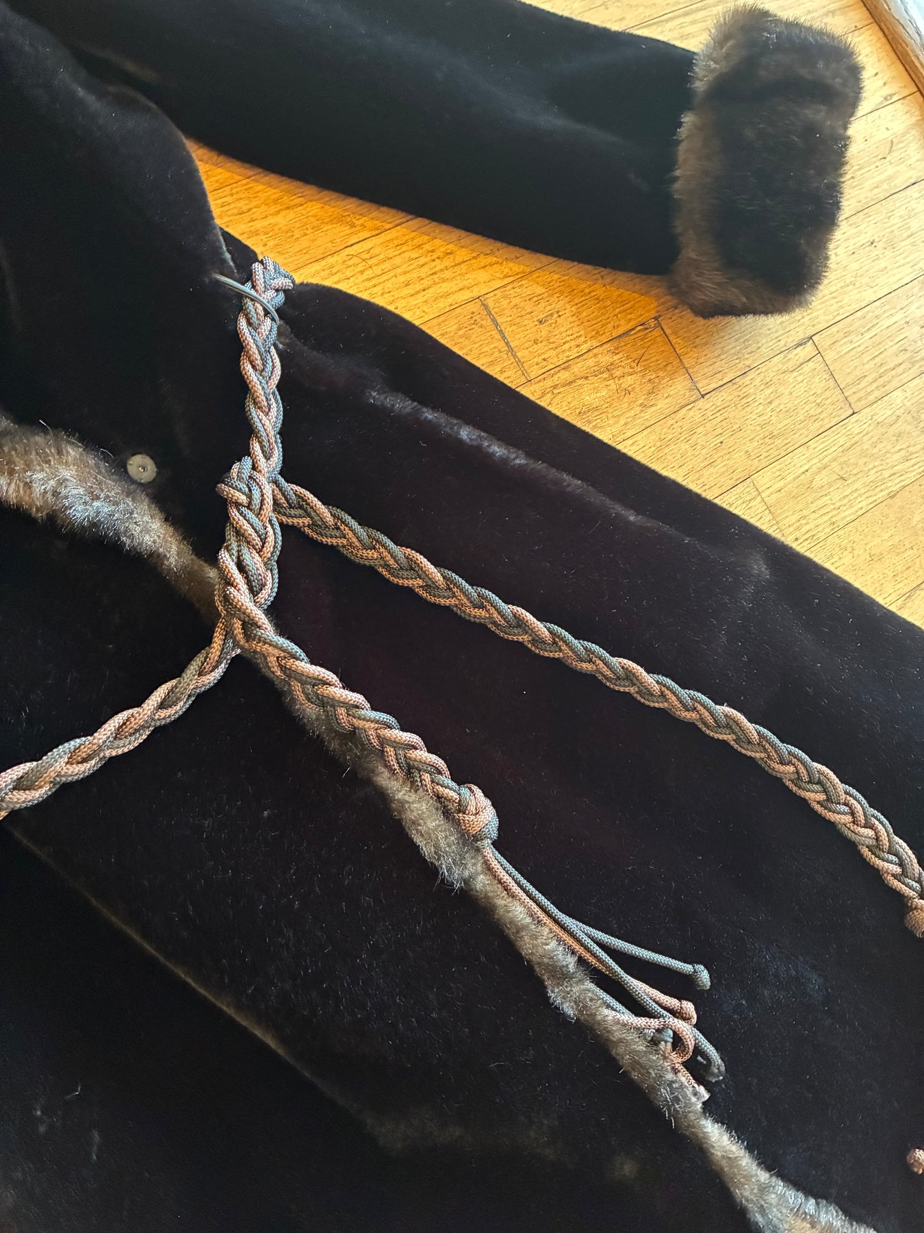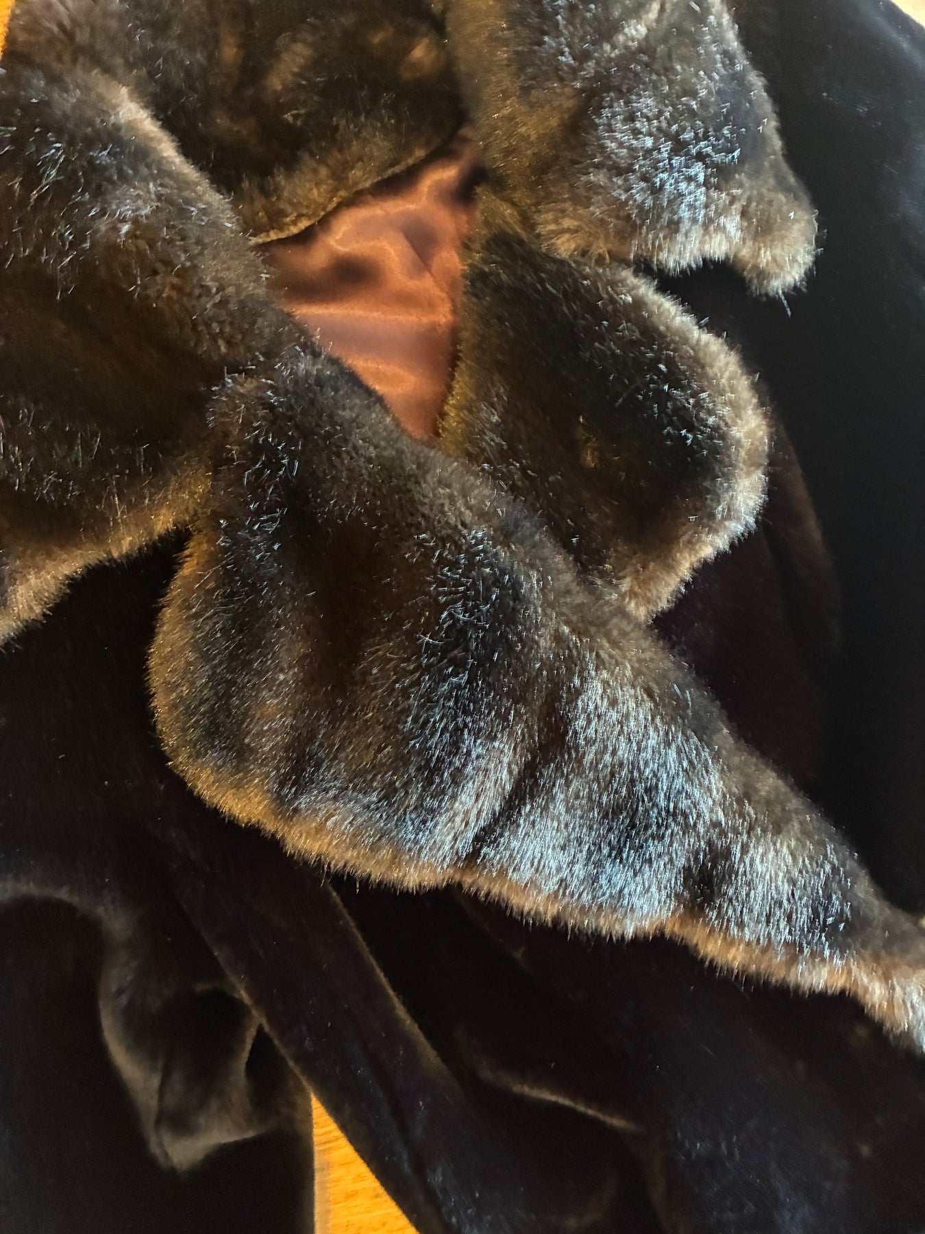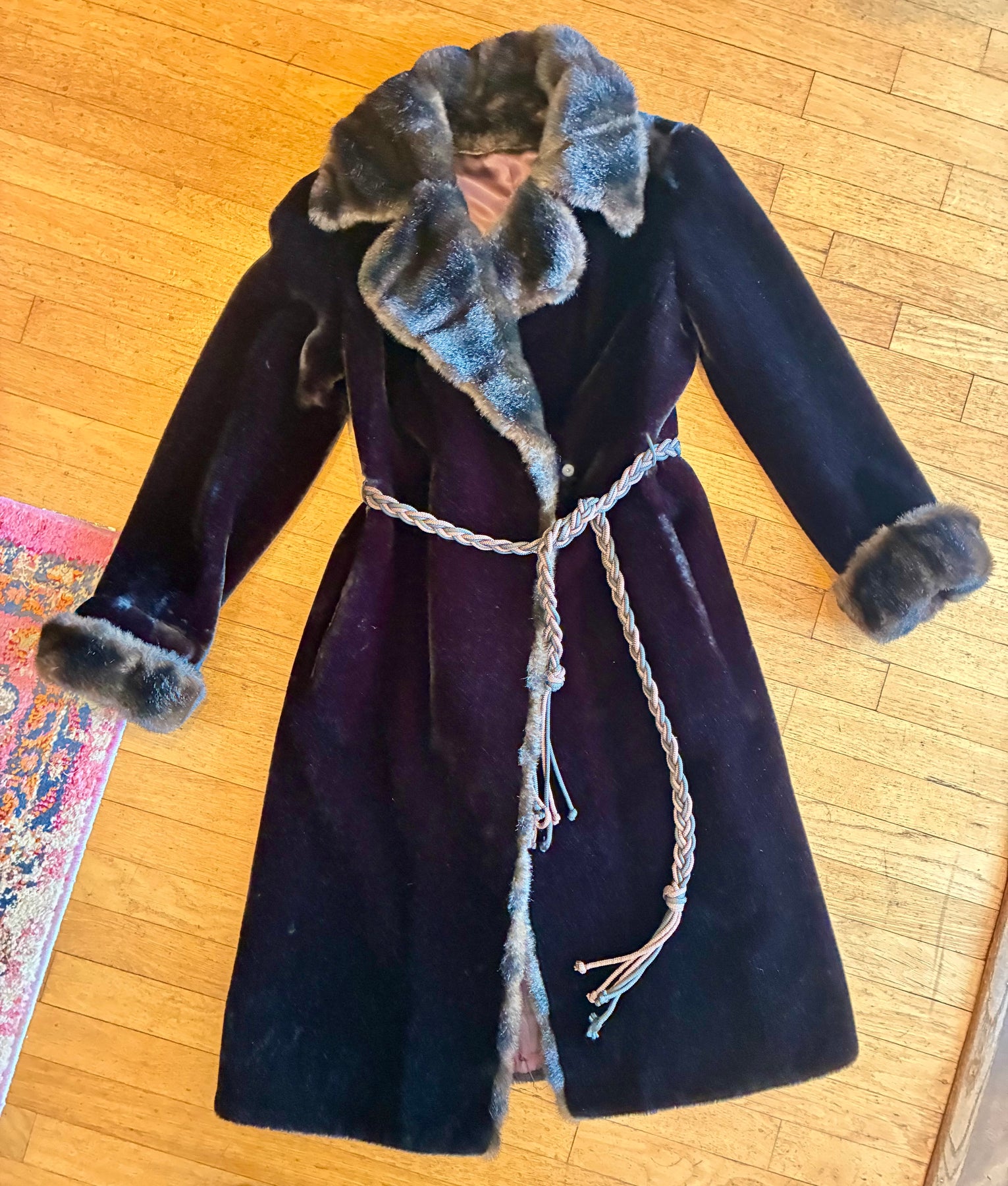 A gorgeous chocolate brown faux fur coat made in Italy by Borgaza Styled by Fairmoor. Perfect condition with a brown and black tasseled belt.