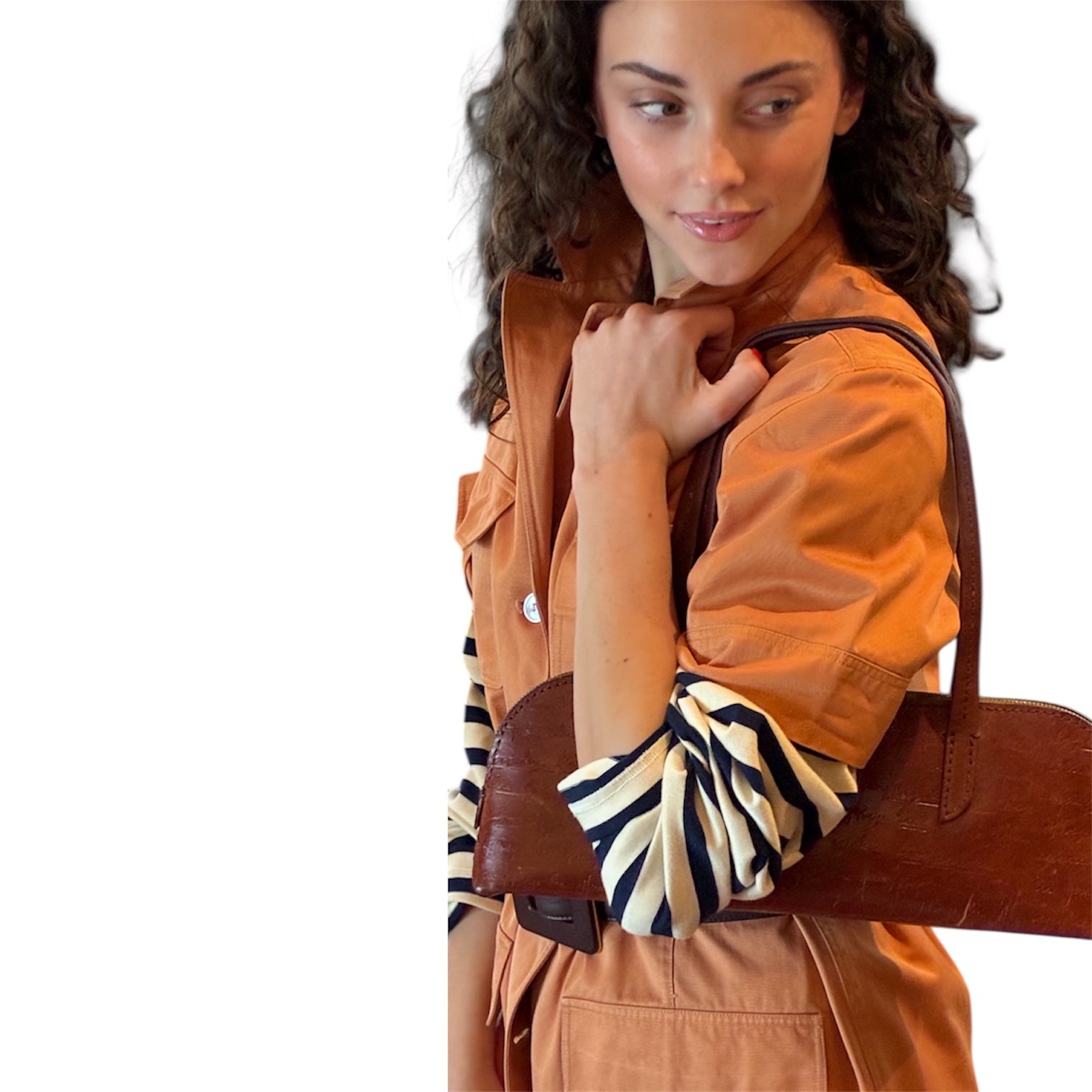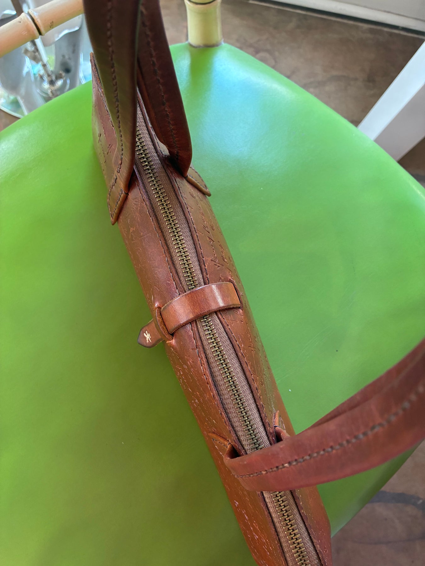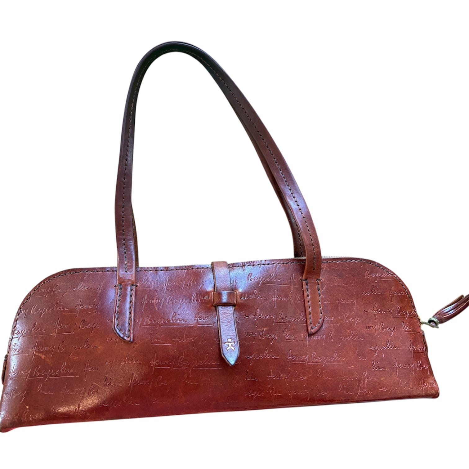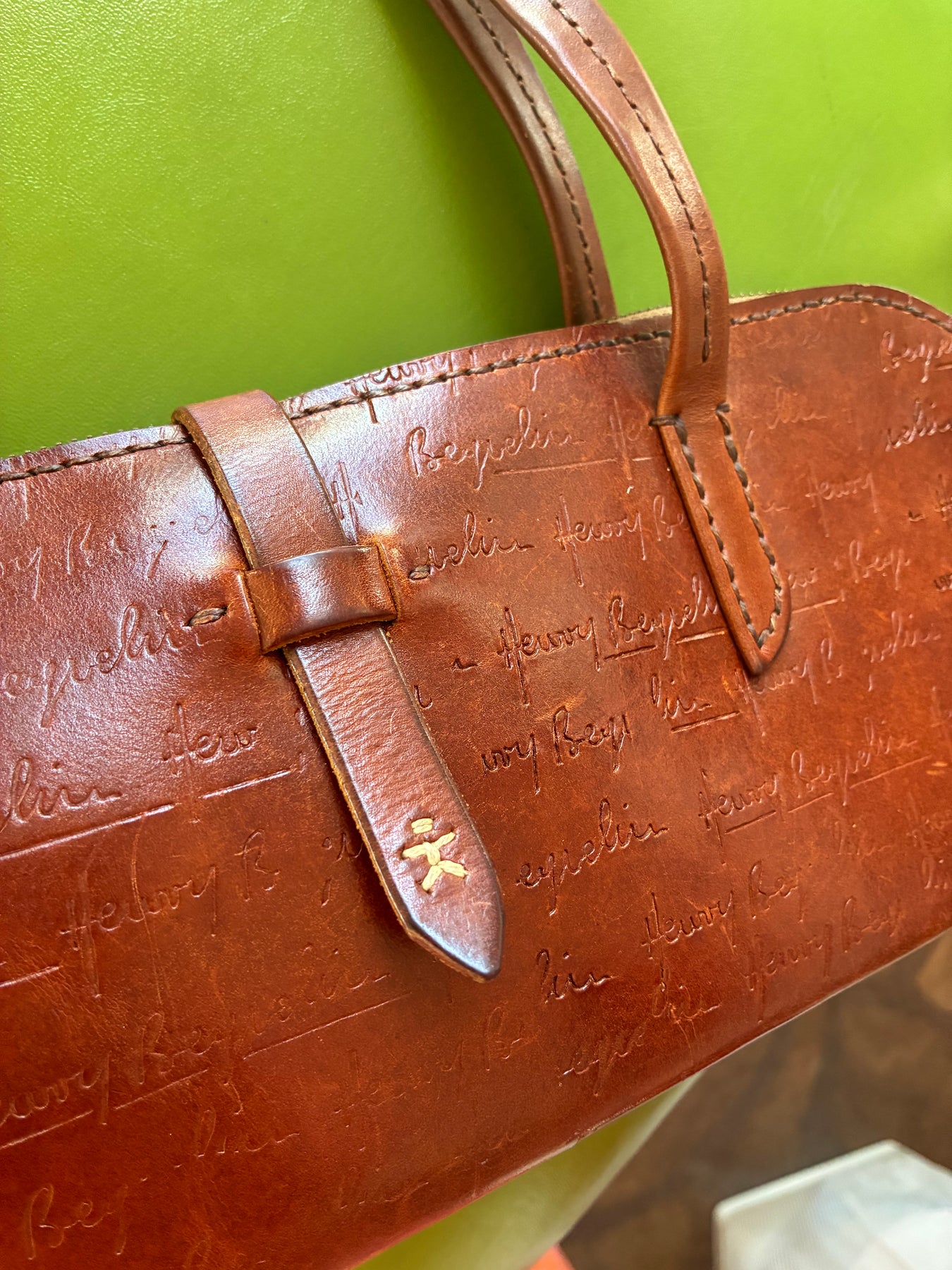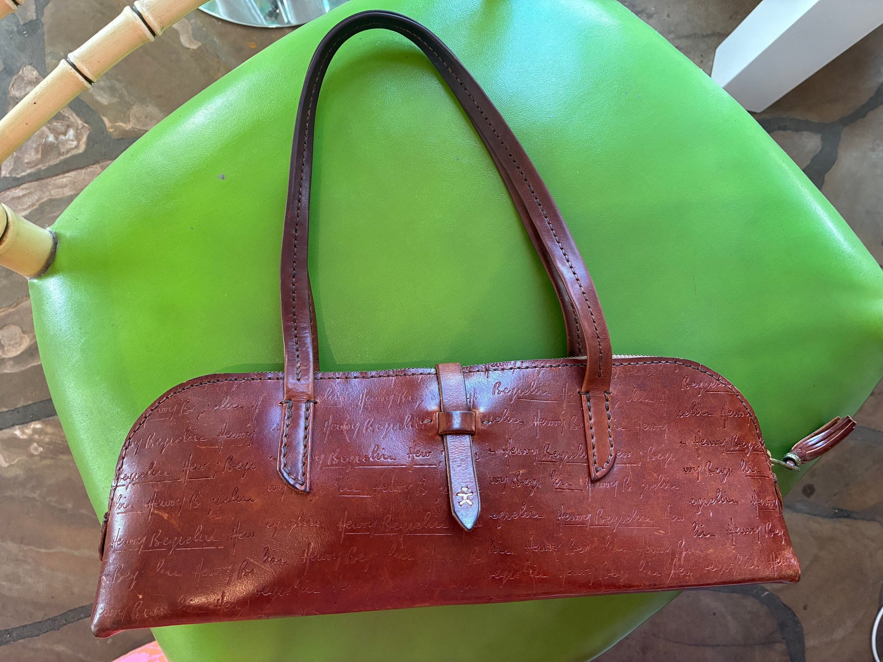 Boho Baguette Tasseled Zip Leather Bag Henry Beguelin inscribed throughout outside of bag. Leather clasp with Beguelin's signature small person at tip of leather. Leather lined