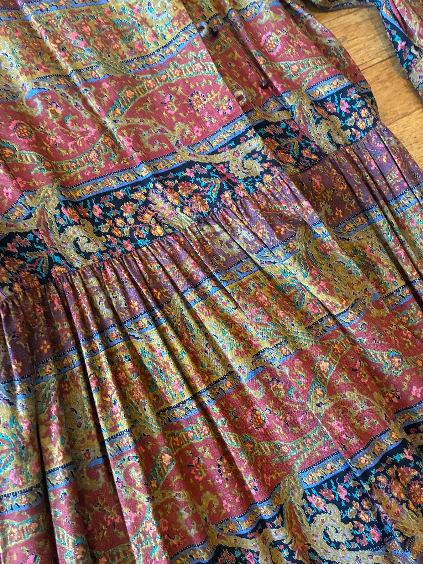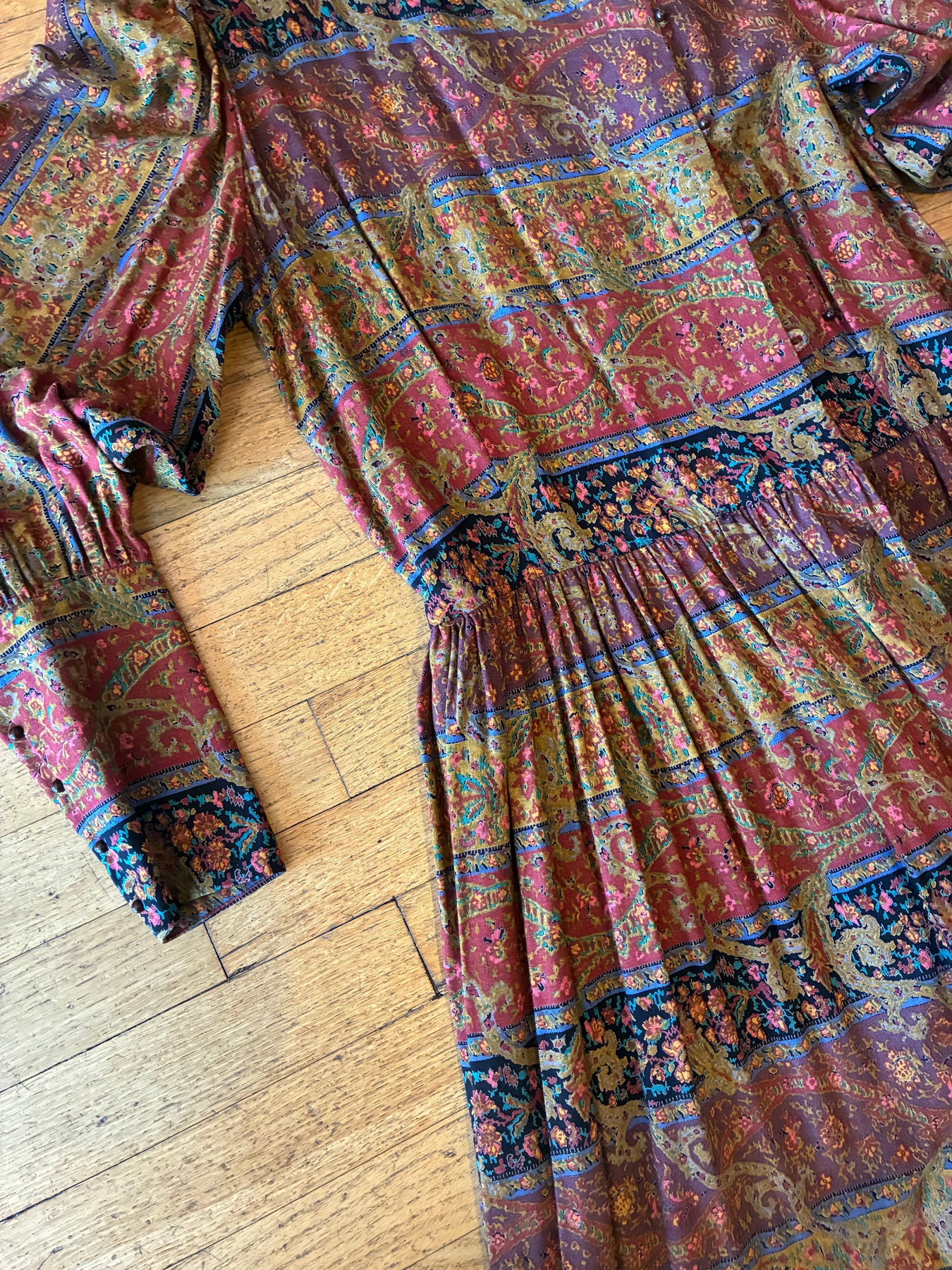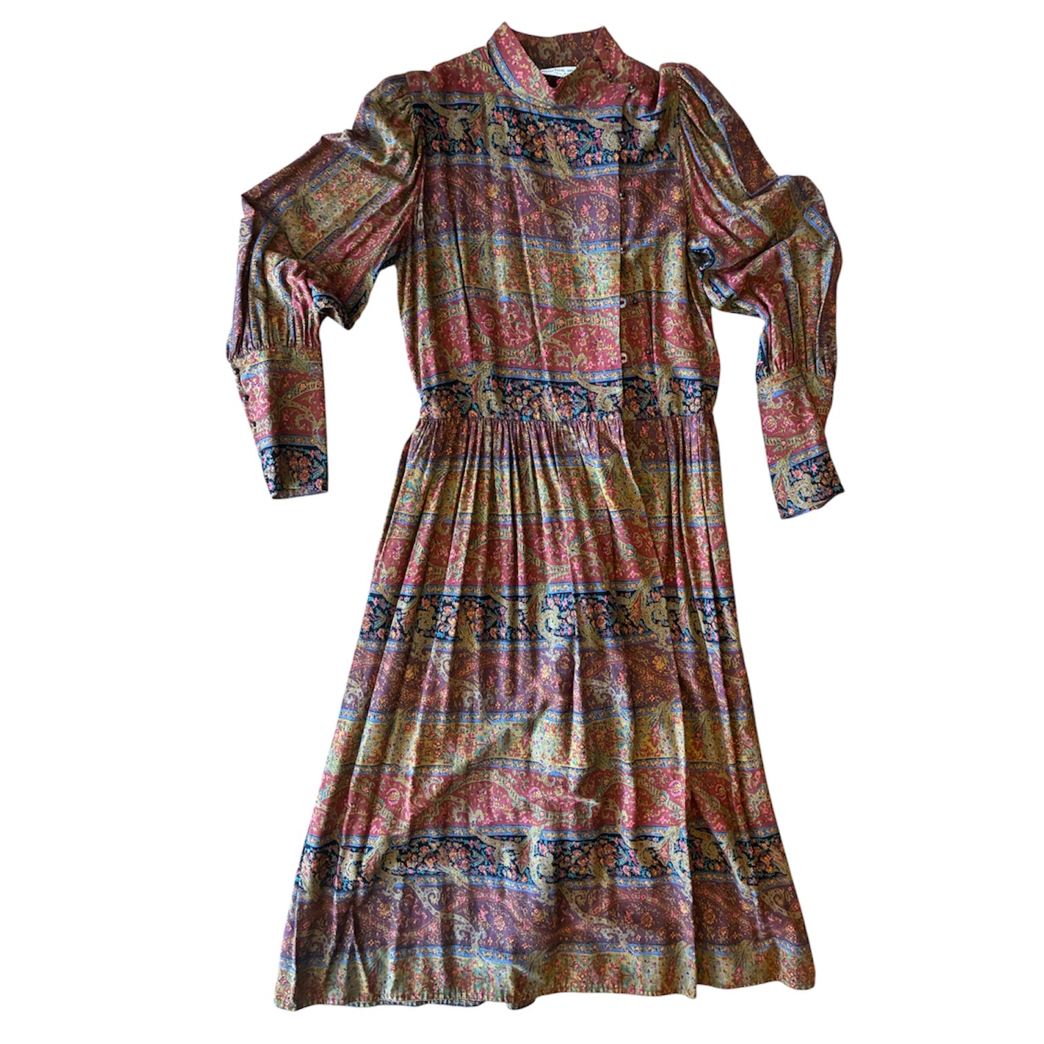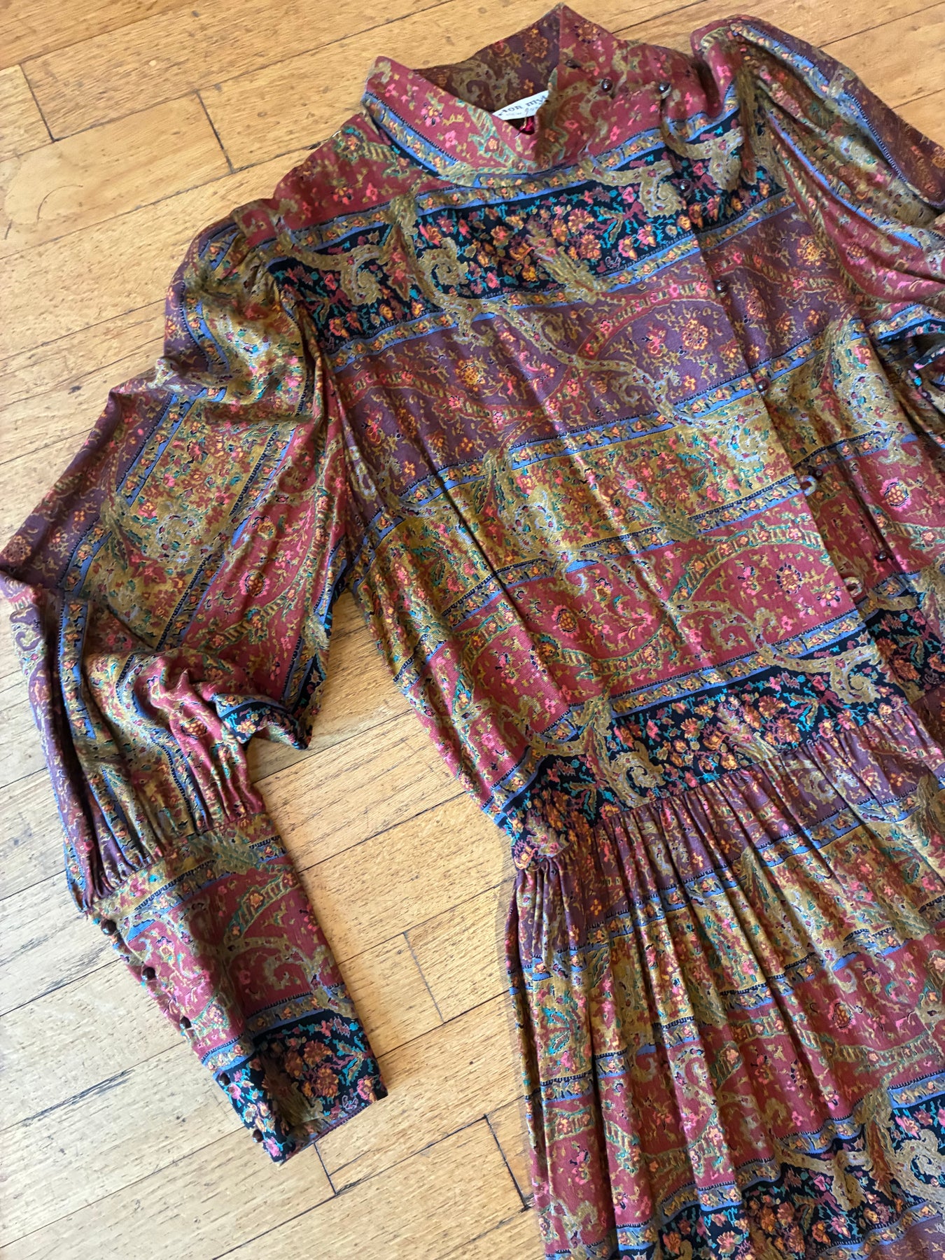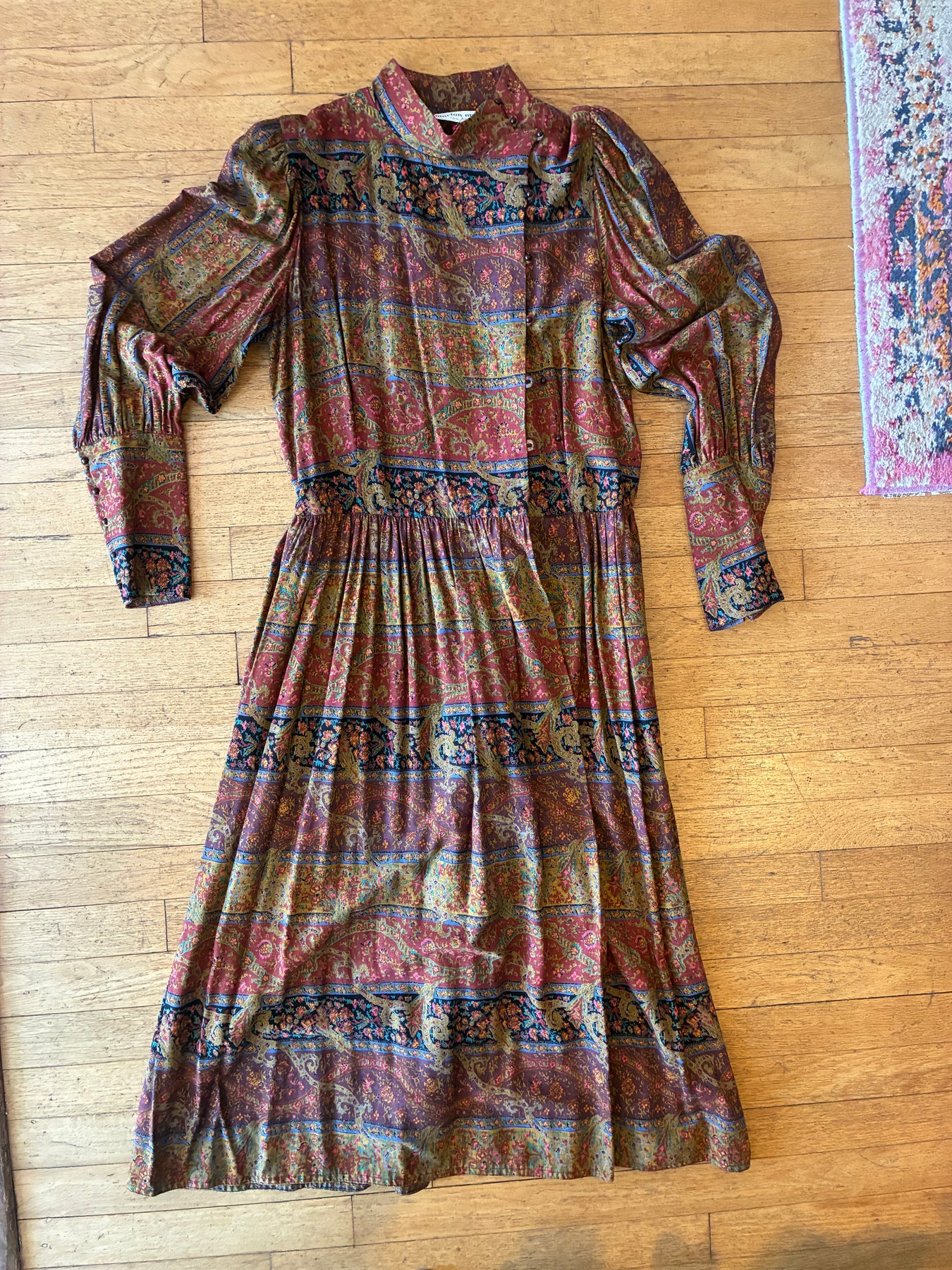 Beautiful fall colors in this Morton Myles Dress with a stand up collar and slight puff at the shoulders. Paisley design in brown, rust, black, and olive. Eight brown buttons at side starting at collar, five buttons at cuffs Great with boots.