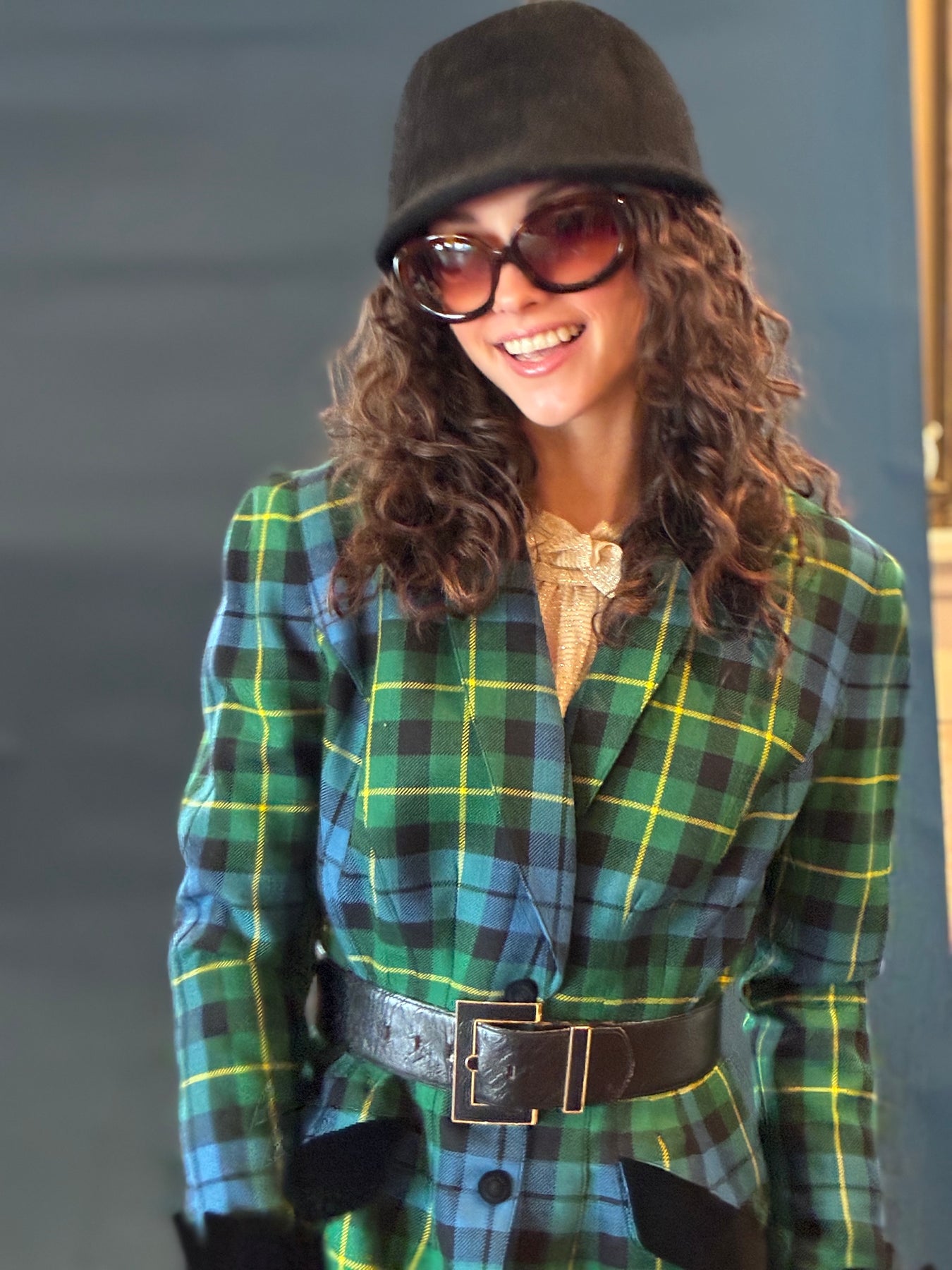 Thierry Mugler Tartan Jacket with a velvet lapel, velvet buttons with snap closure and velvet pockets. Unique and oh so chic. Mugler was known for emphasizing the female form and this jacket is proof of this aesthetic.