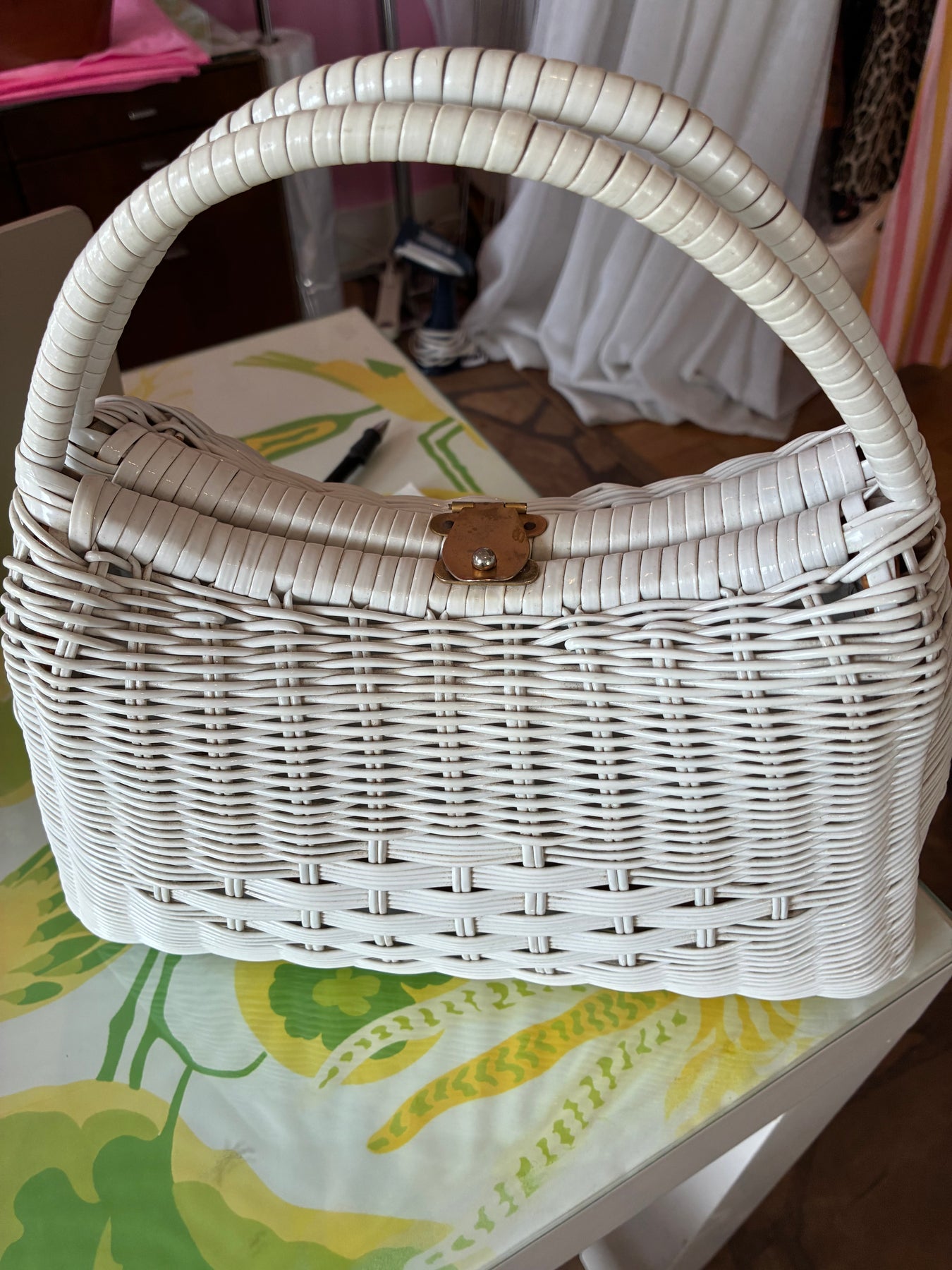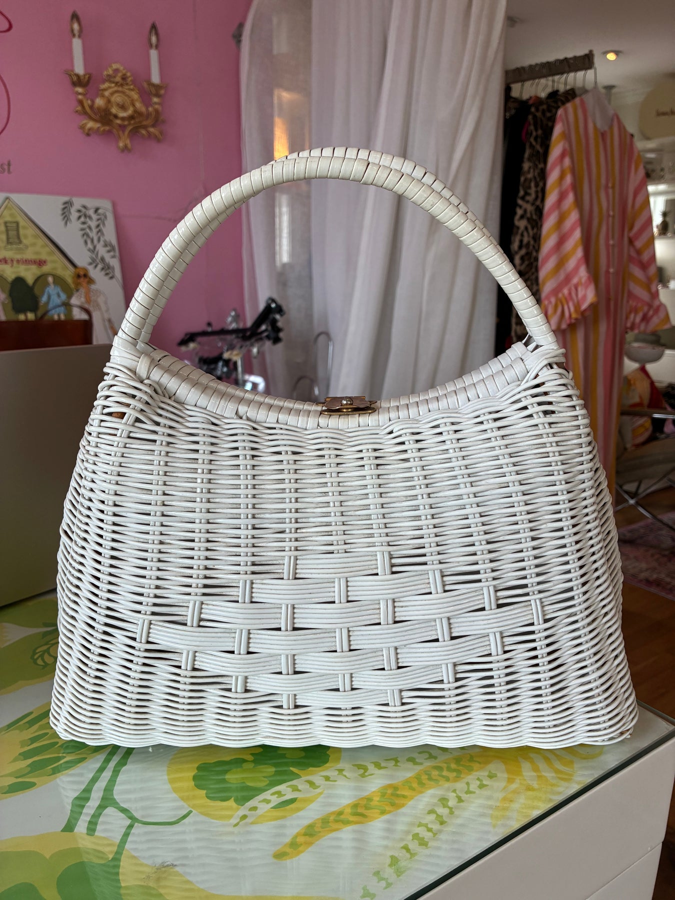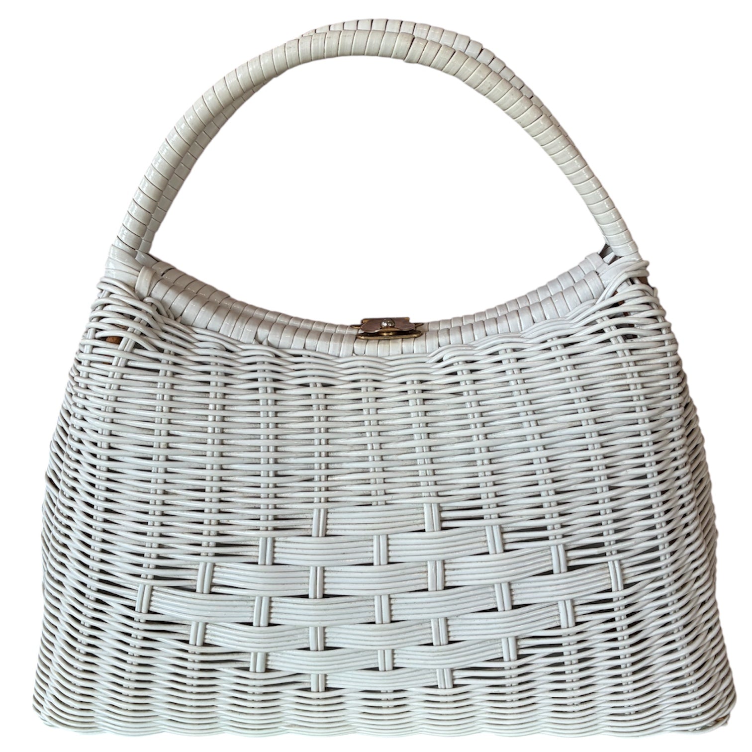 Beautiful White Wicker Bag with a basket weave detail in the middle and a goldtone clasp. Excellent condition, clean interior in white. 8" x11". handle drop 6"