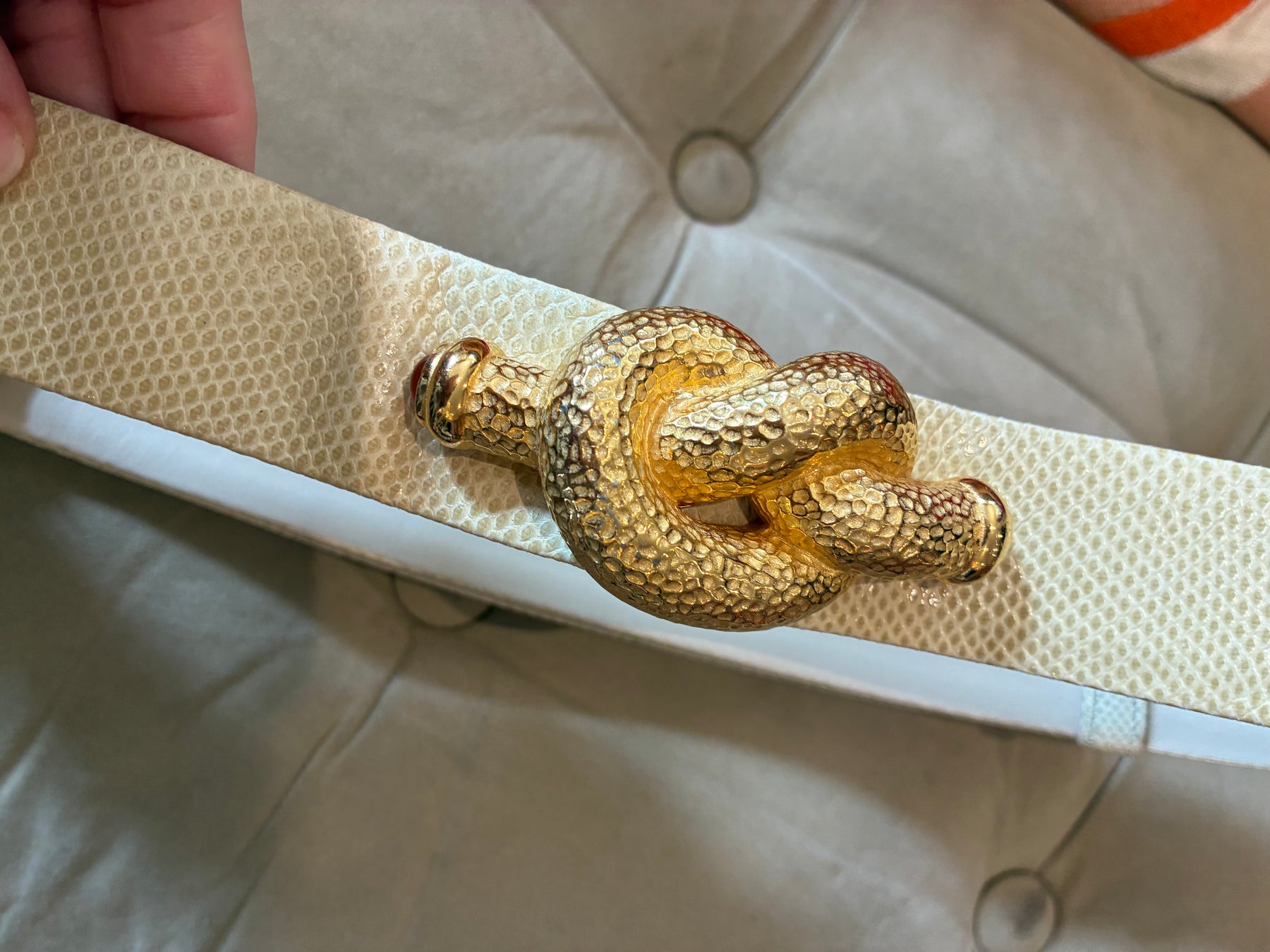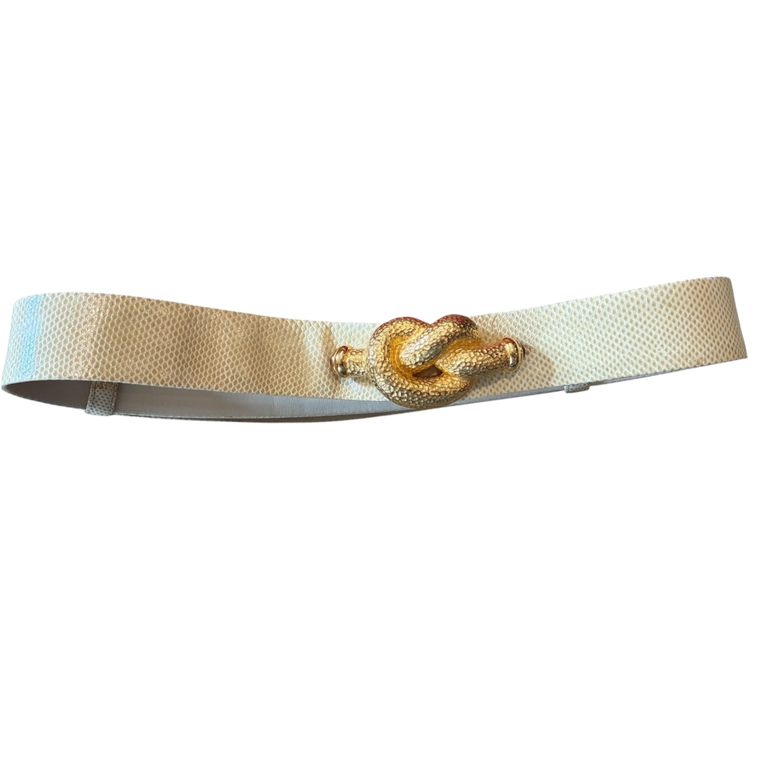 Lovely cream Judith Leiber adjustable belt with goldtone knot buckle in front with Cabochon Tiger Eye at ends of knot. Gorgeous Extends to 36"