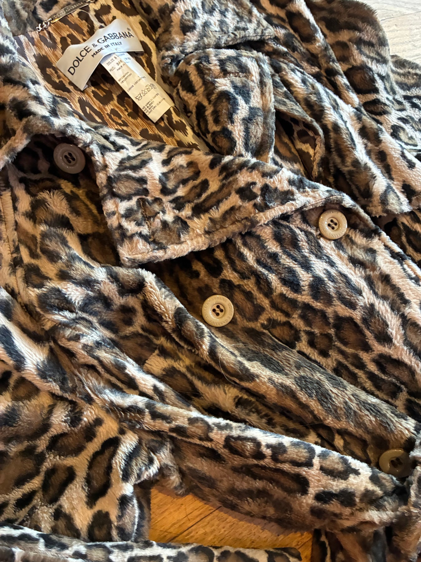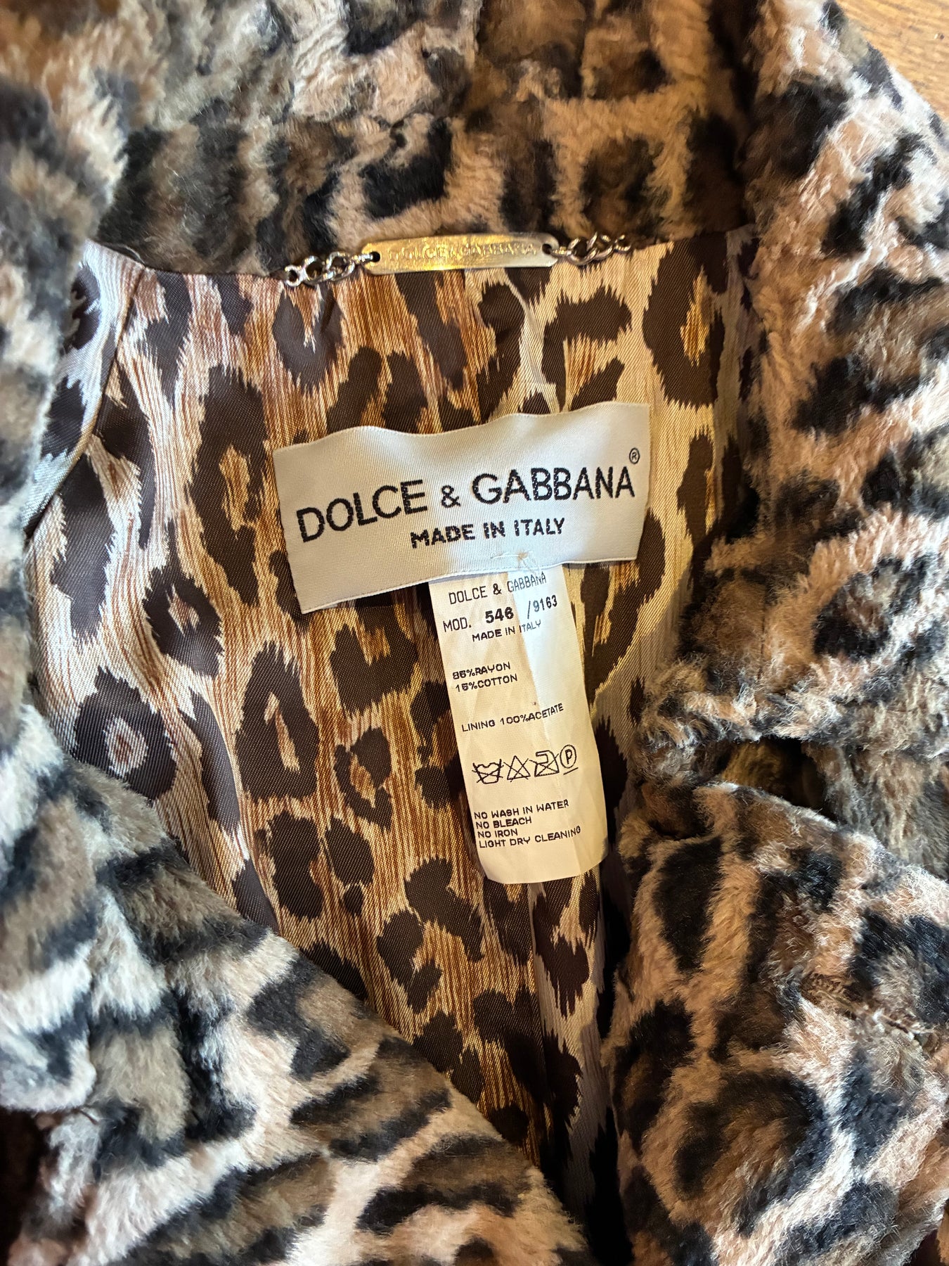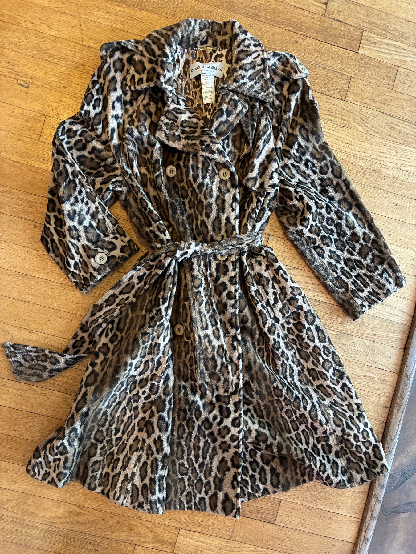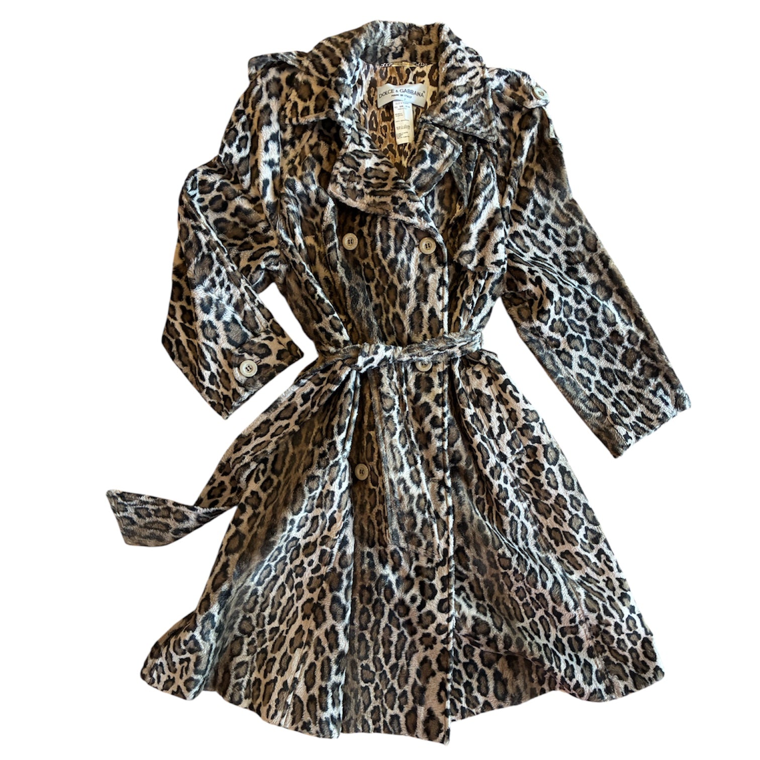 Double Breasted Dolce & Gabbana Leopard Coat with a spread collar and epaulets at shoulders, bands at cuffs. Silk lined in a lighter colored leopard print. Belted at waist. Two side pockets Stunning as only Dolce & Gabbana can be.
