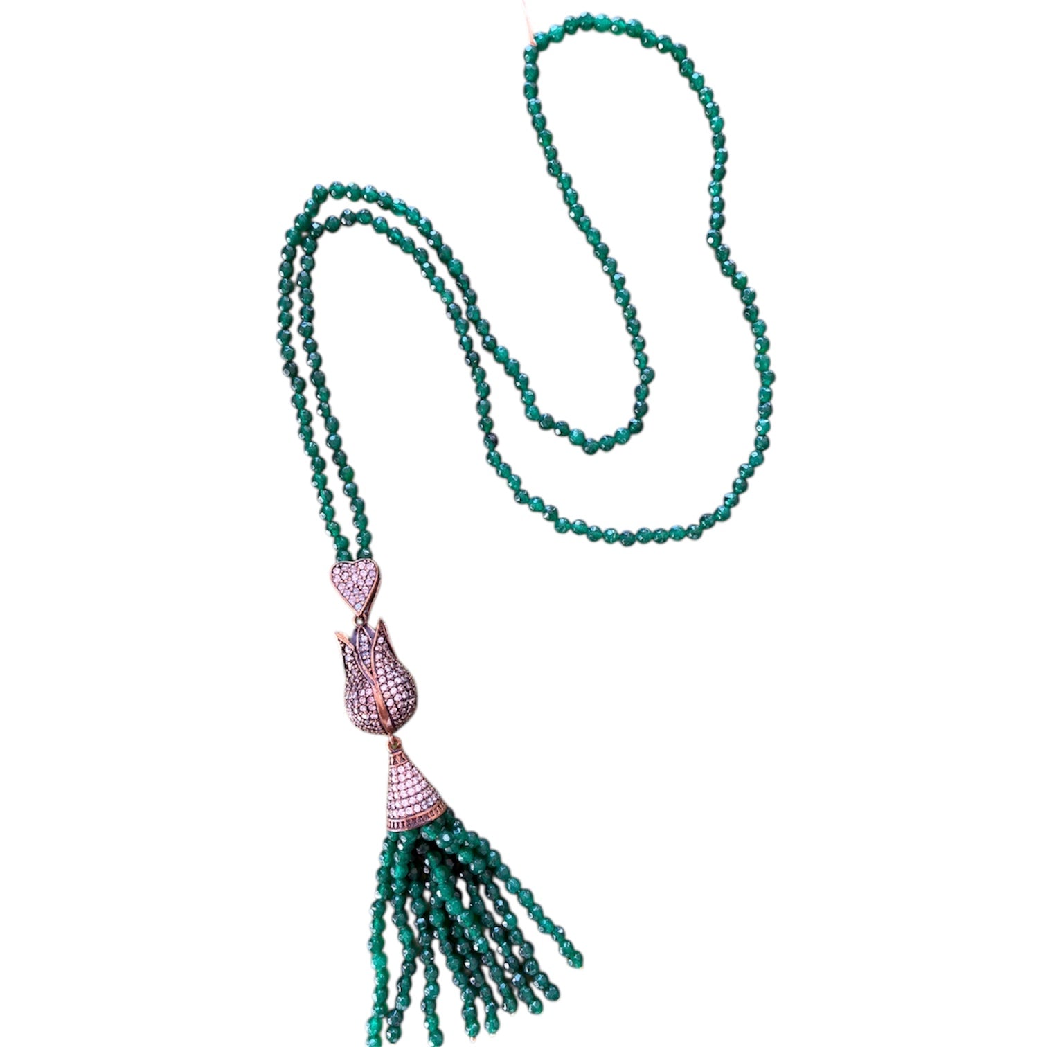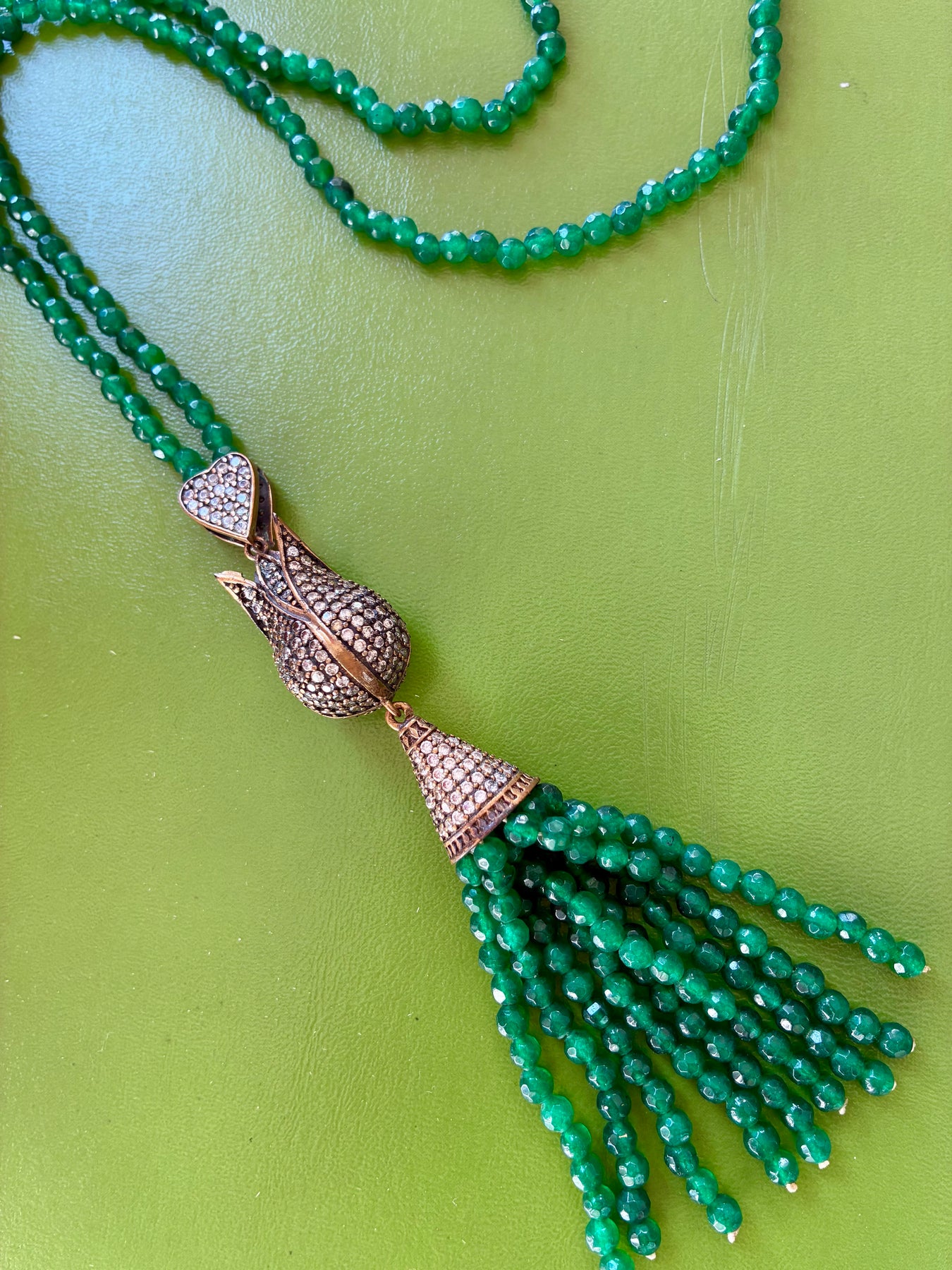 Green beaded necklace with brass pave rhinestone drop heart and tulip leading to a tassel of more green stones. Beautiful