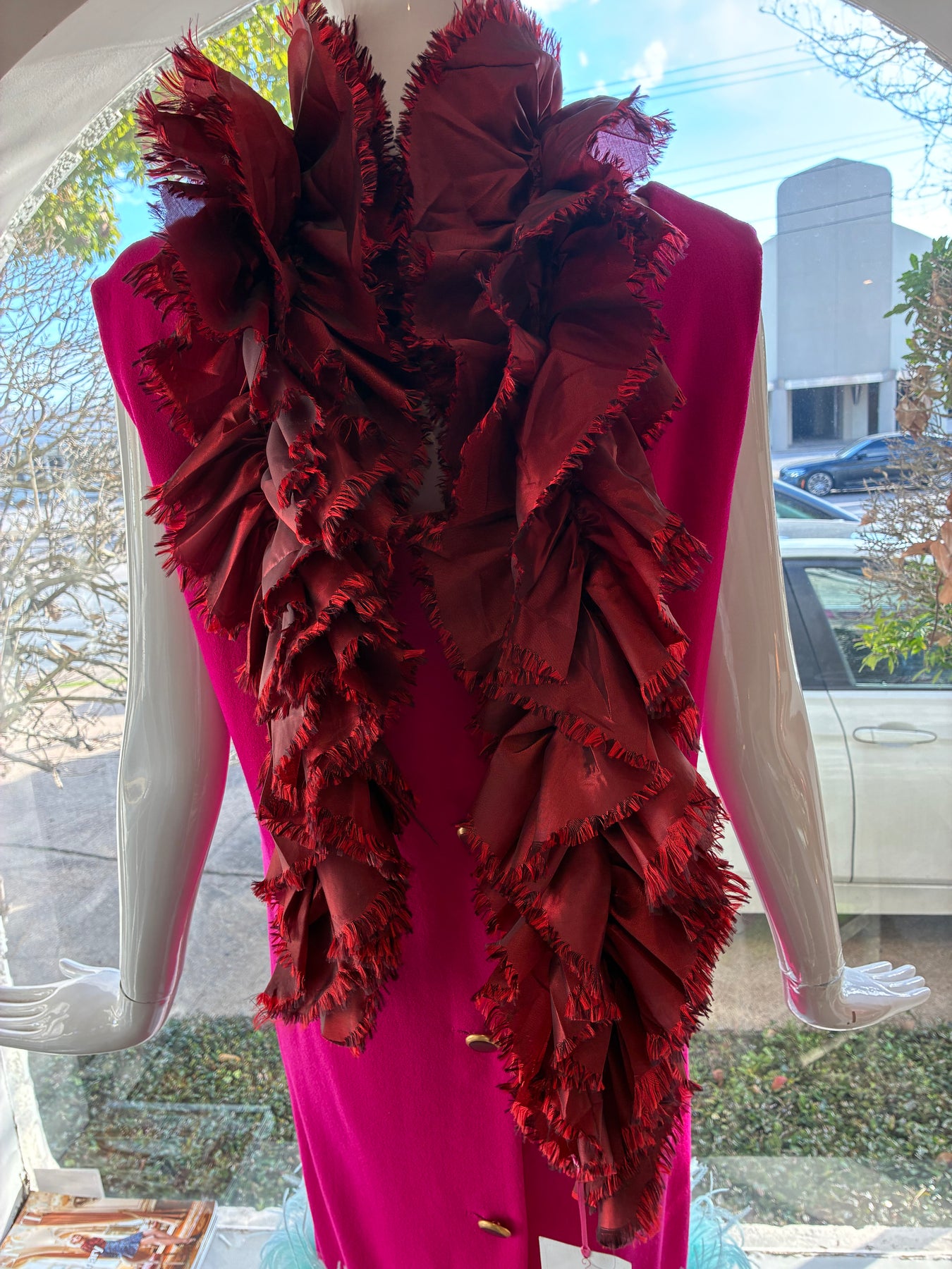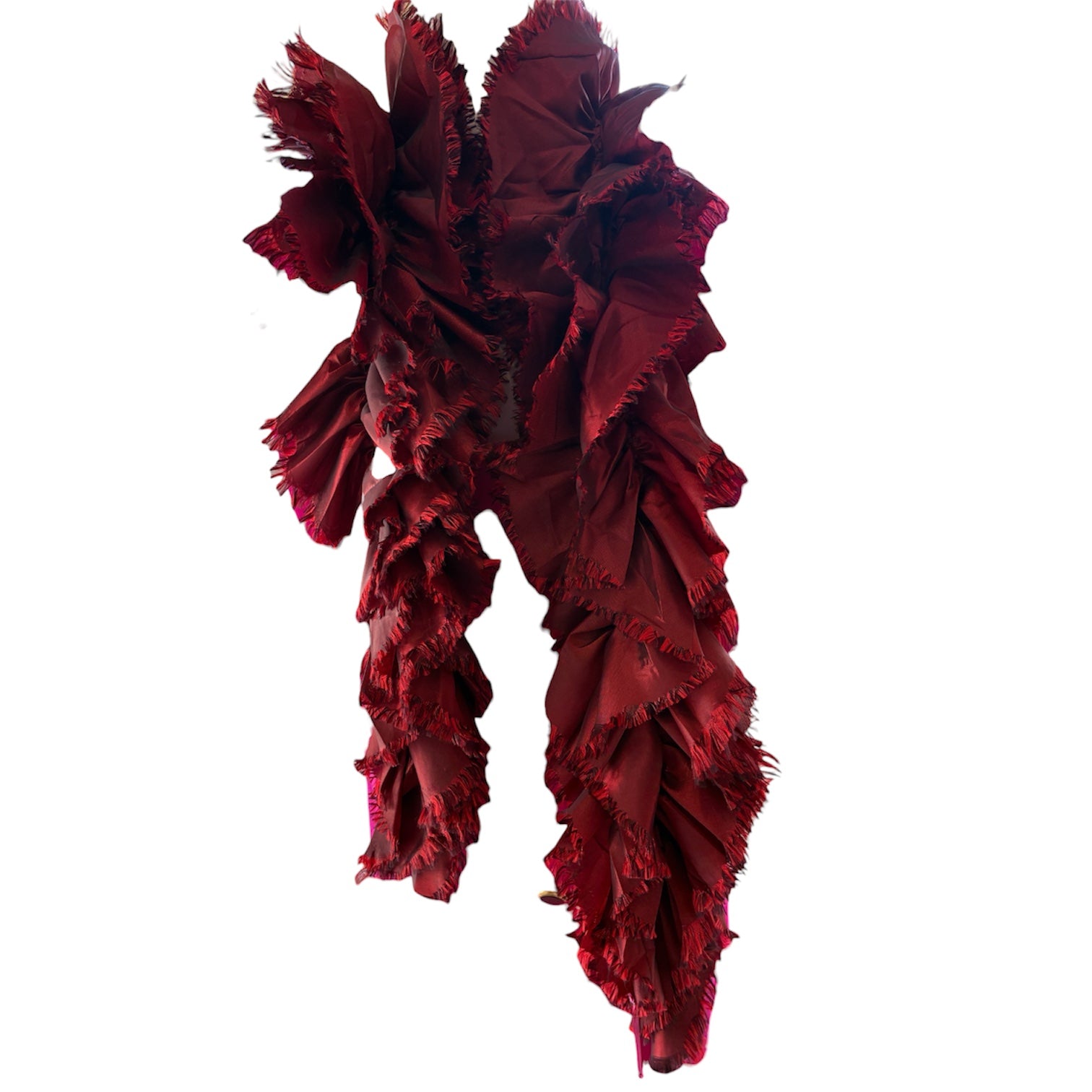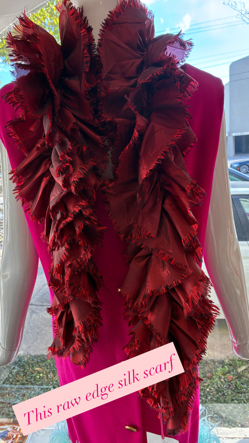 Lovely red raw silk edged, ruffled, narrow scarf.