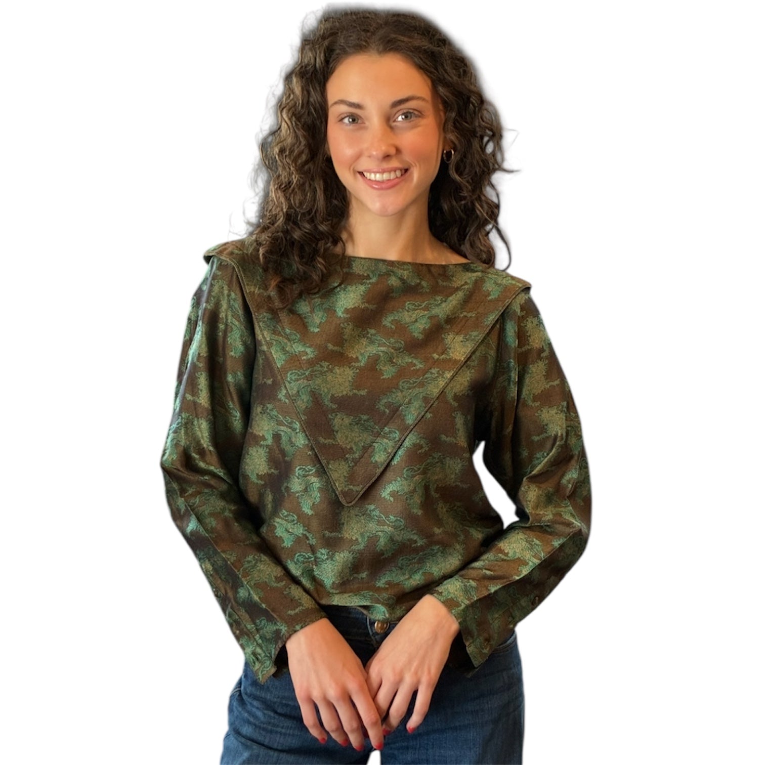 Great silk fall Tahari blouse in great fall shades of brown, olive, rust with a round, collar, with a capped detail atop a slight puffed sleeve.