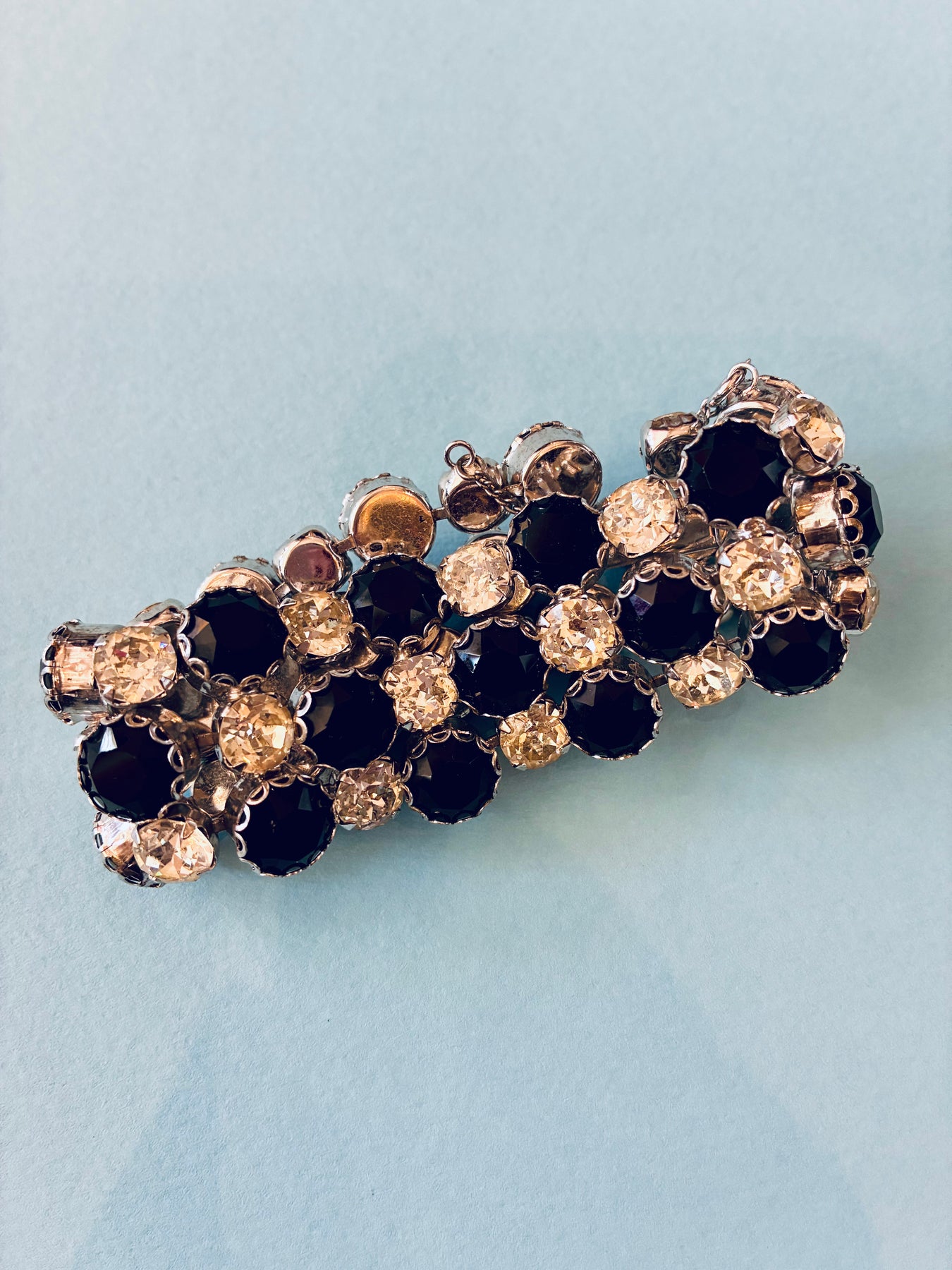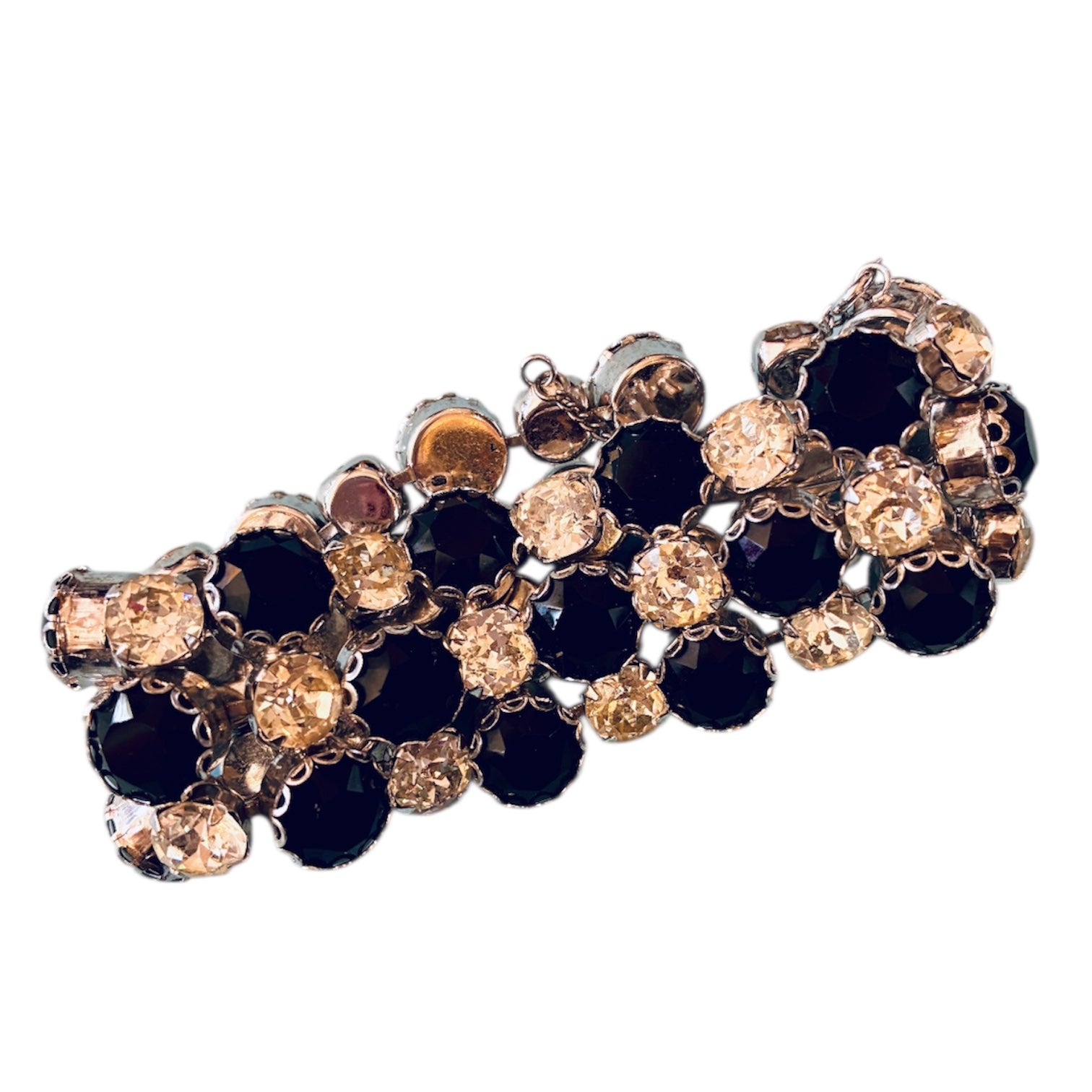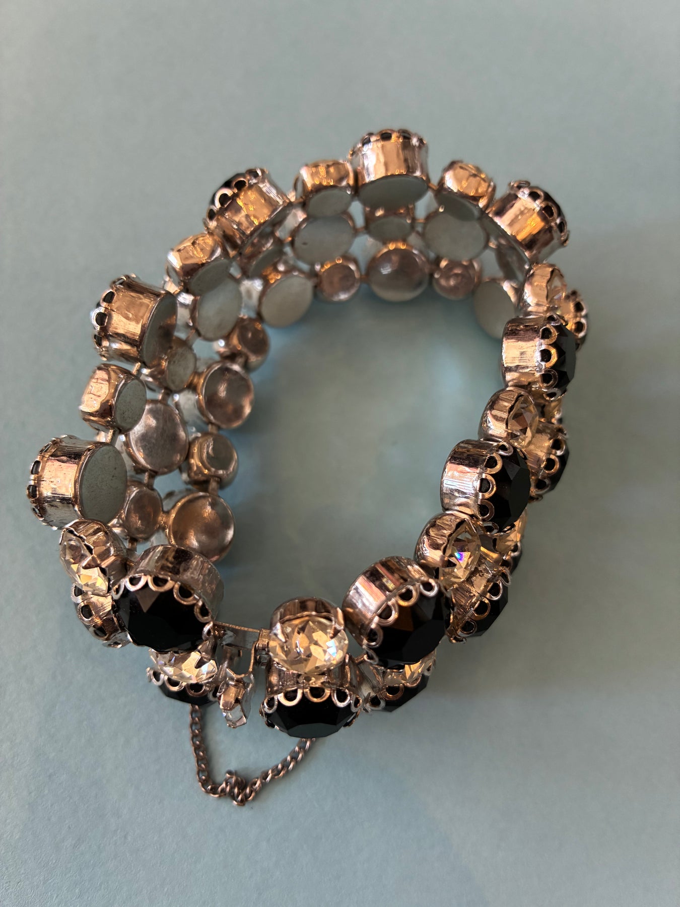 A super glam jet and rhinestone triple layer bracelet, set in silvertone. Glamorous and chic. Very art deco style. 1" around