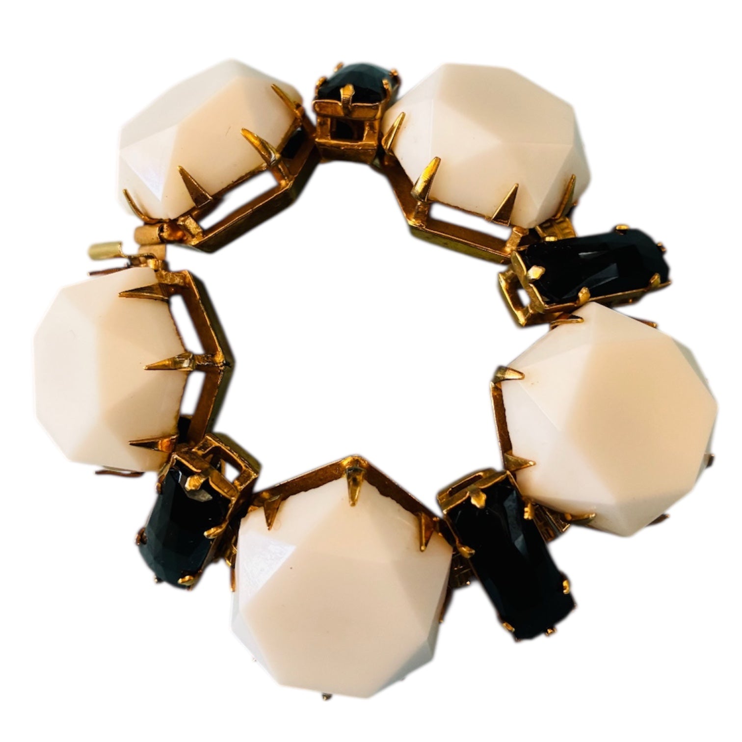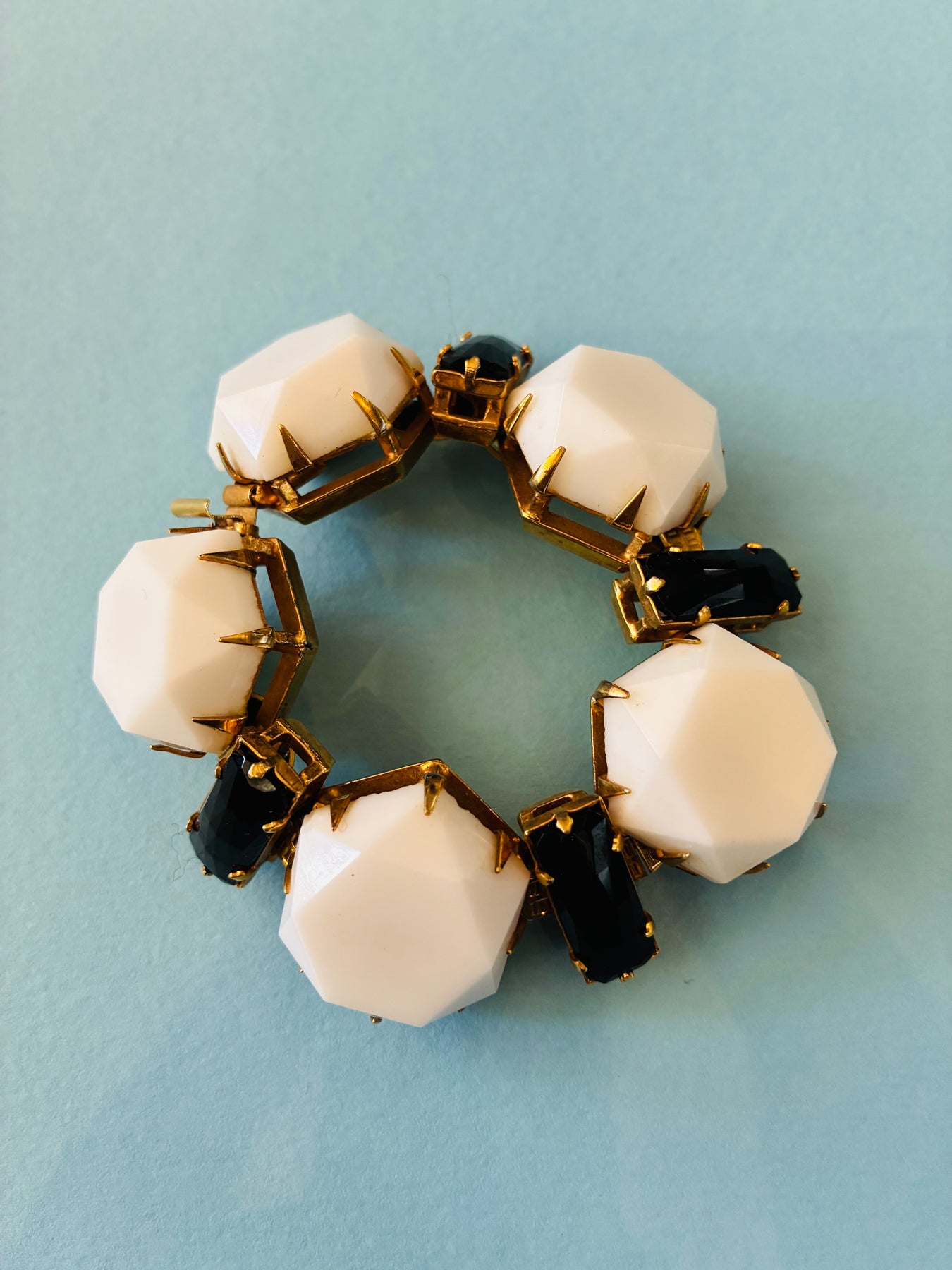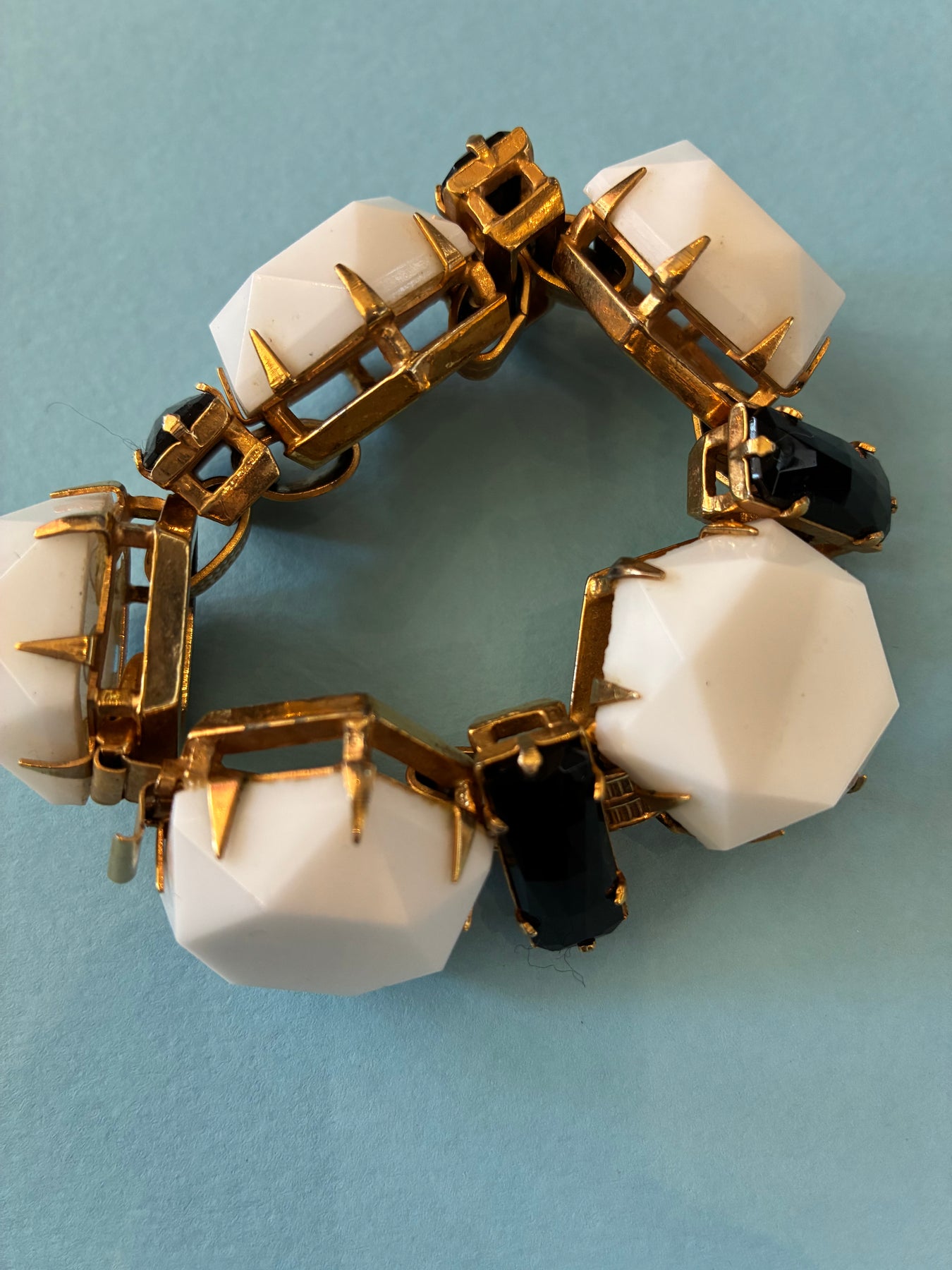 A super cool 1960's bracelet with white round resin stones set in goldtone with black rectangular pieces in between. 1" wide.
