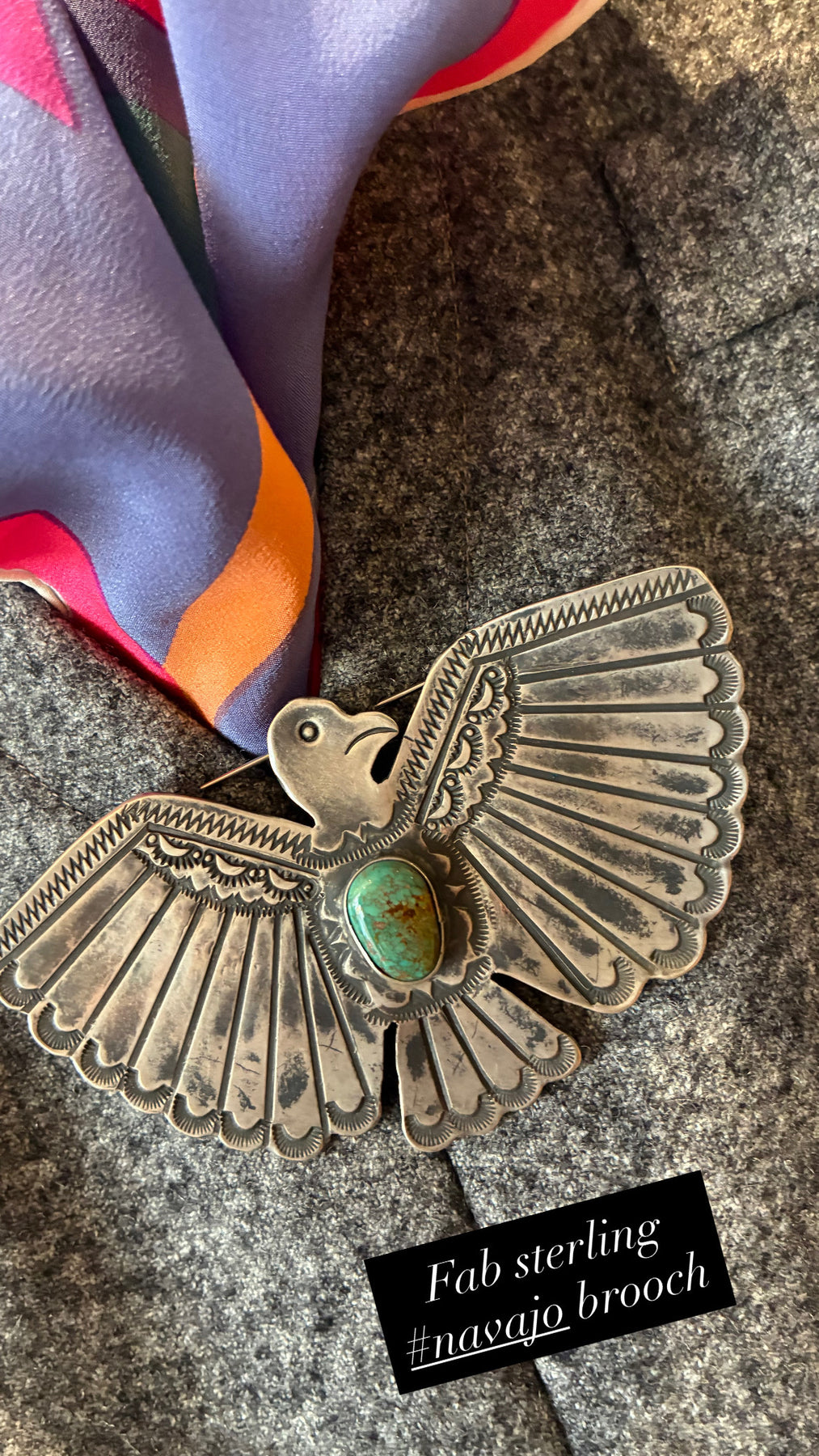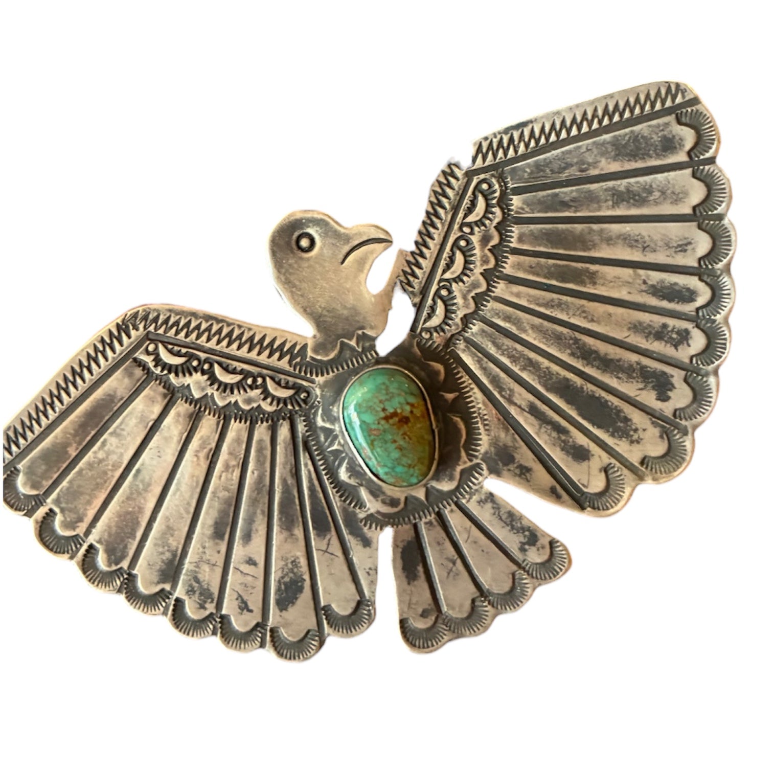 4" Sterling silver Thunderbird with turquoise stone in center. A stunning and distinctive piece.