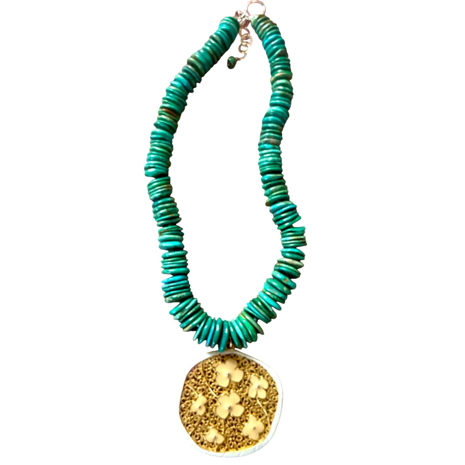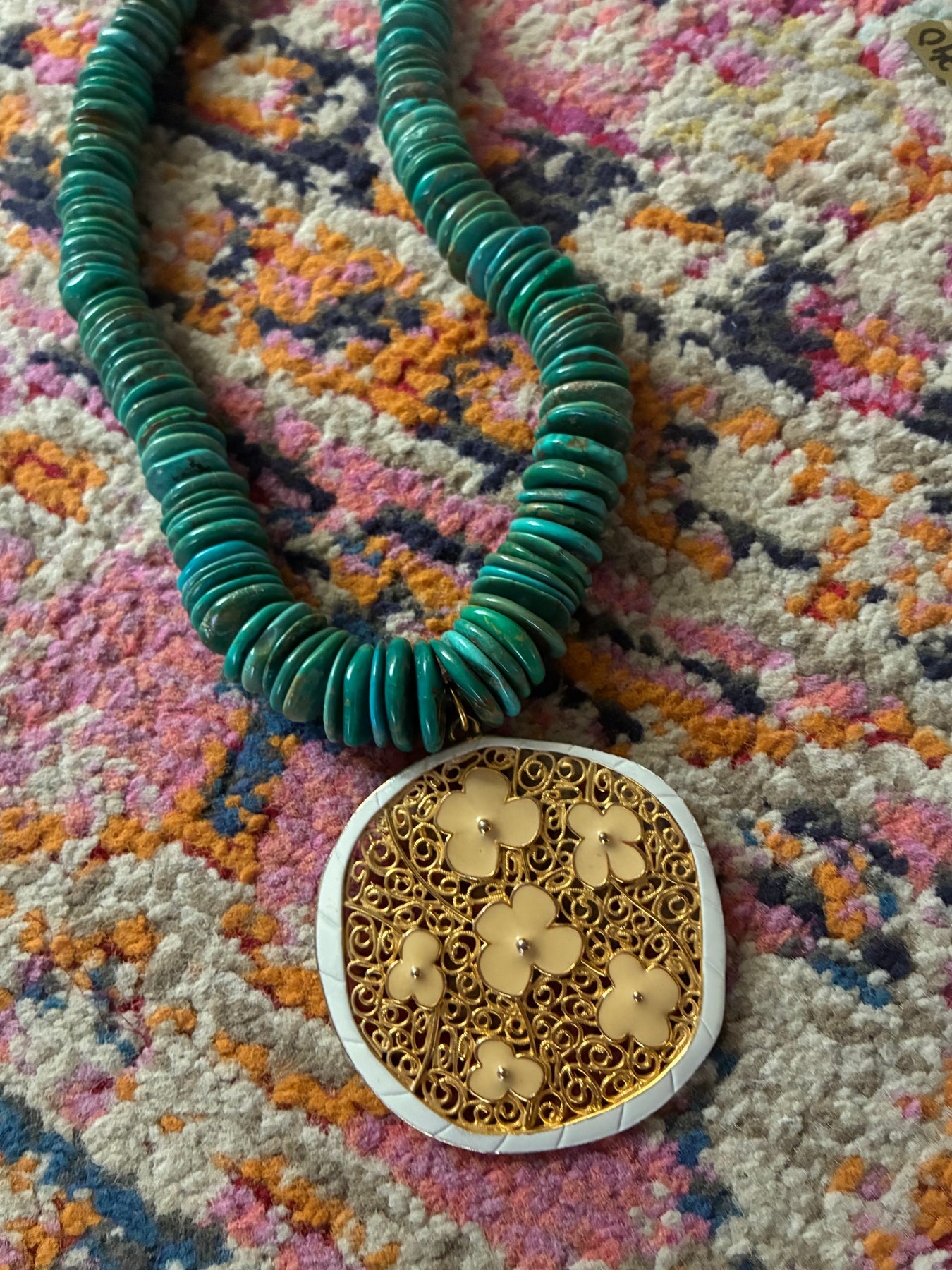 Another of our upcycled pendants fashioned from disks of turquoise with a cool enameled flower pendant. Striking and wearable.